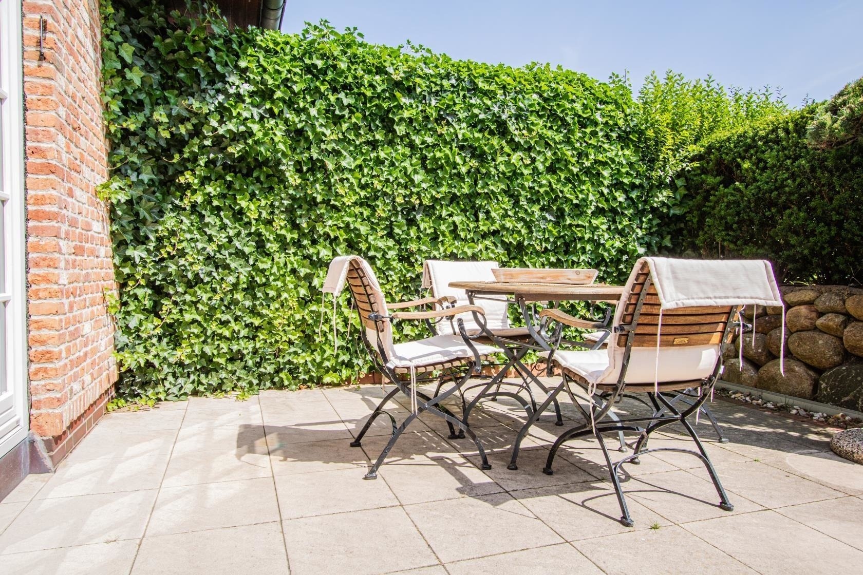 Die Ferienwohnung verfügt über eine private Terrasse, die ideal zum Entspannen im Freien einlädt. Hier kann man die frische Luft genießen und die natürliche Umgebung bestaunen. Der Außenbereich bietet genug Platz für gemütliche Stunden, sei es bei einem ausgedehnten Frühstück oder einem entspannten Abend unter freiem Himmel. Ein perfekter Rückzugsort für erholsame Tage.