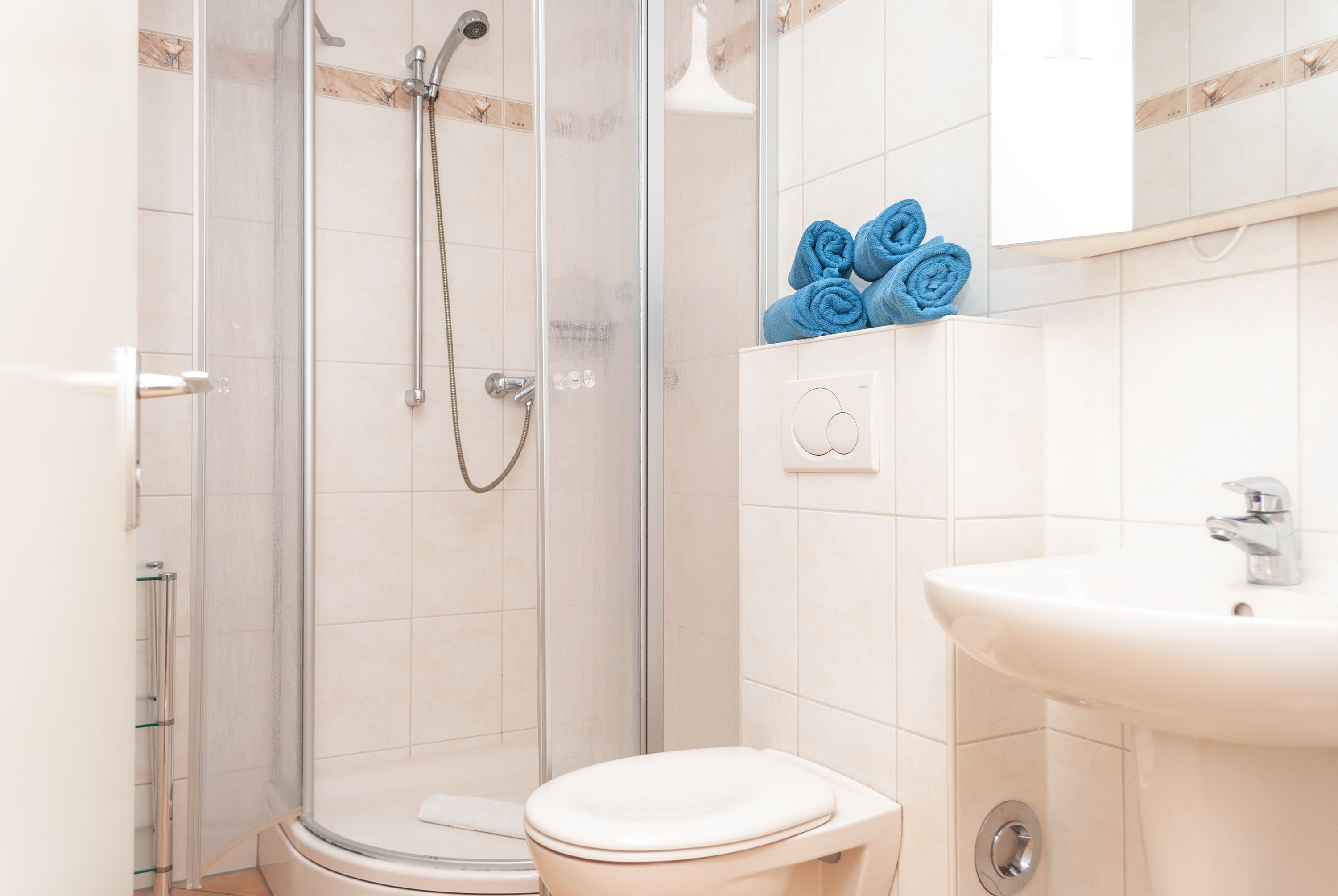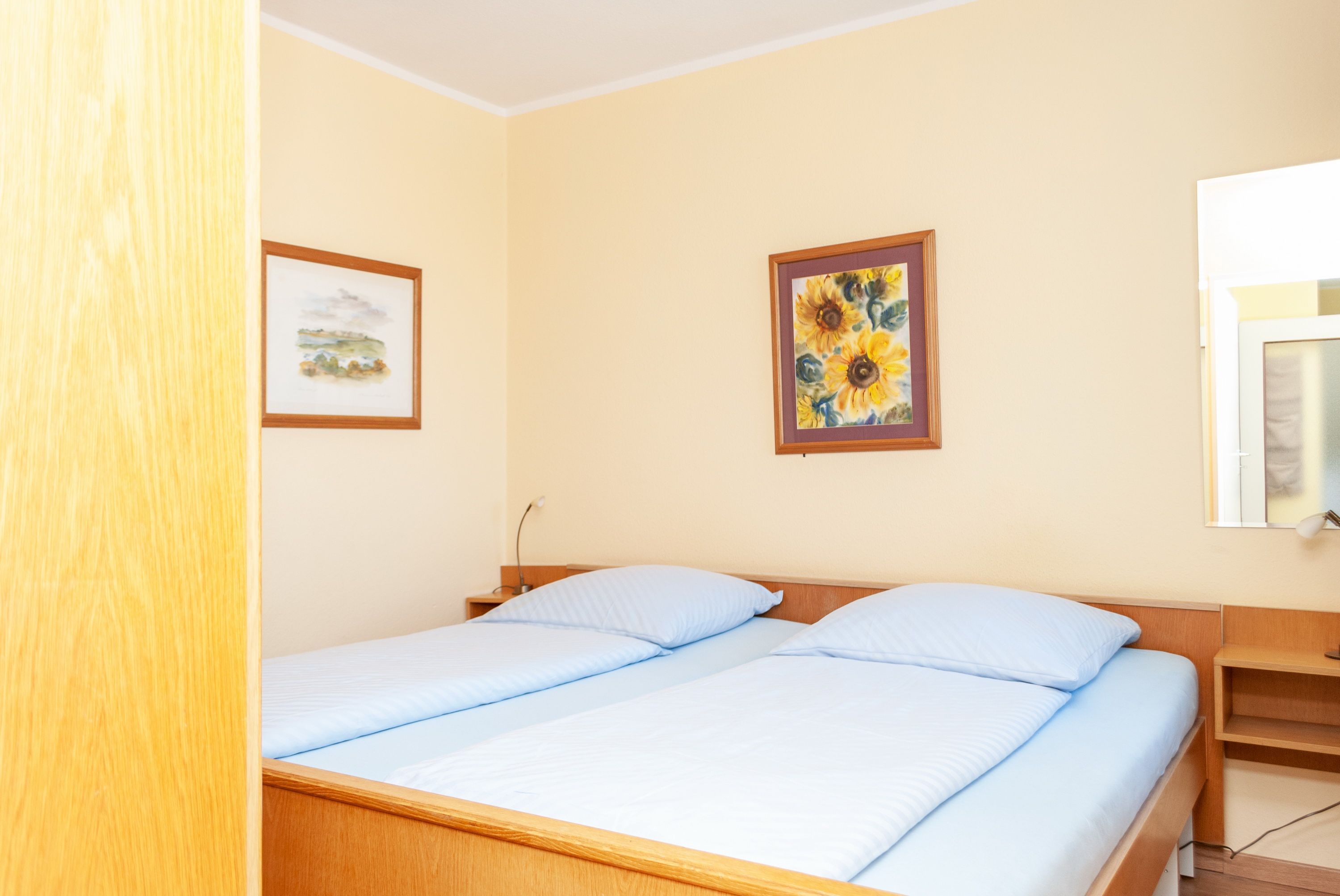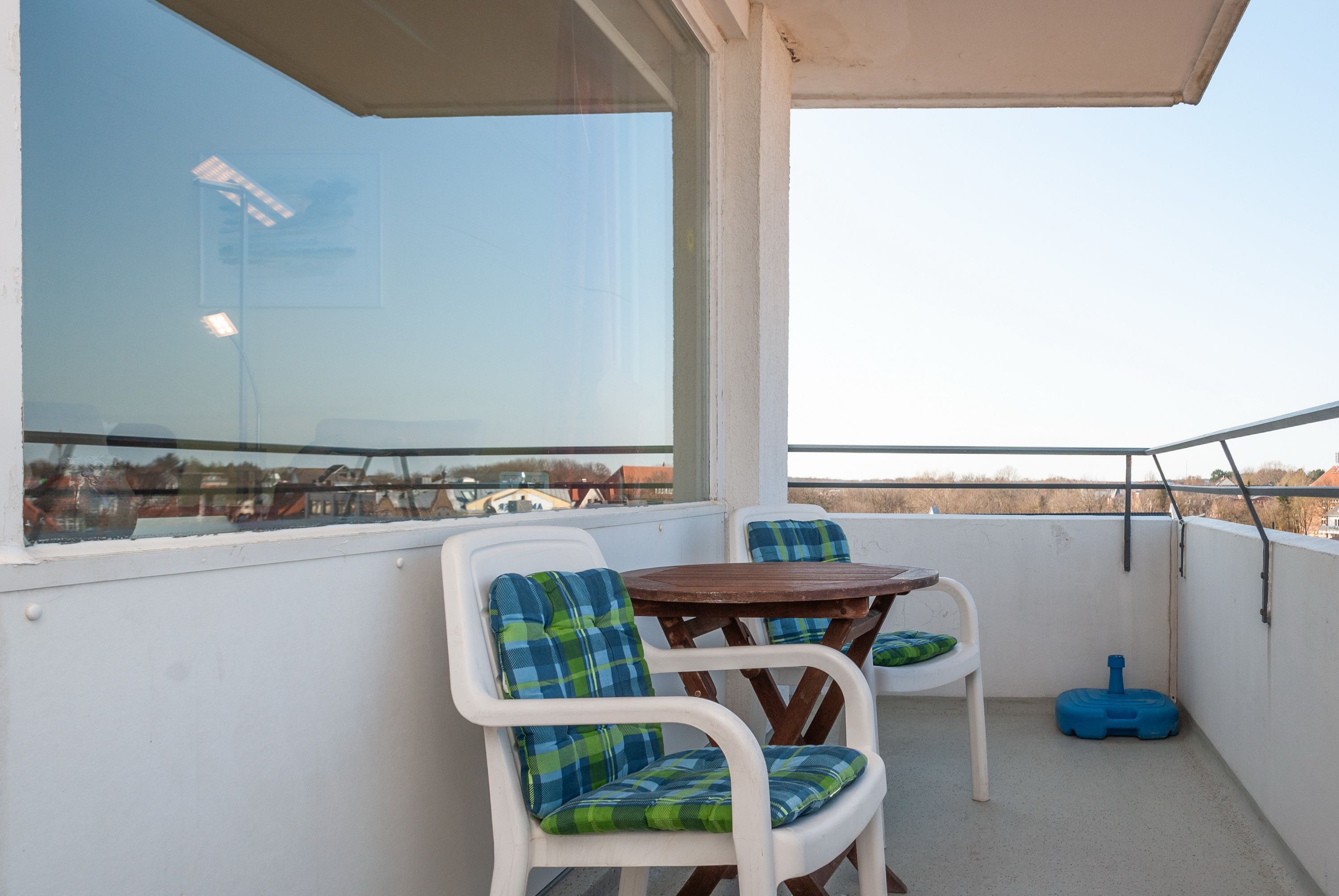 Das Apartment 501 ist ein 2-Raum-Apartment im 5. Obergeschoss für bis zu 2 Erwachsene Personen und 2 Kinder mit 50 qm. Der Westbalkon mit Meerblick bietet Ihnen vormittags Schatten und nachmittags Sonne.
