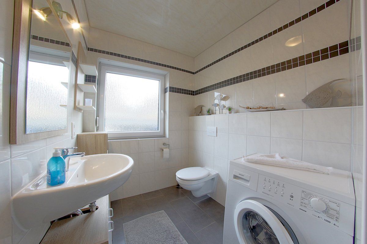 Im Erdgeschoss befindet sich das helle Duschbad mit bodengleicher Dusche und Waschmaschine, im Obergeschoss ein weiteres WC.