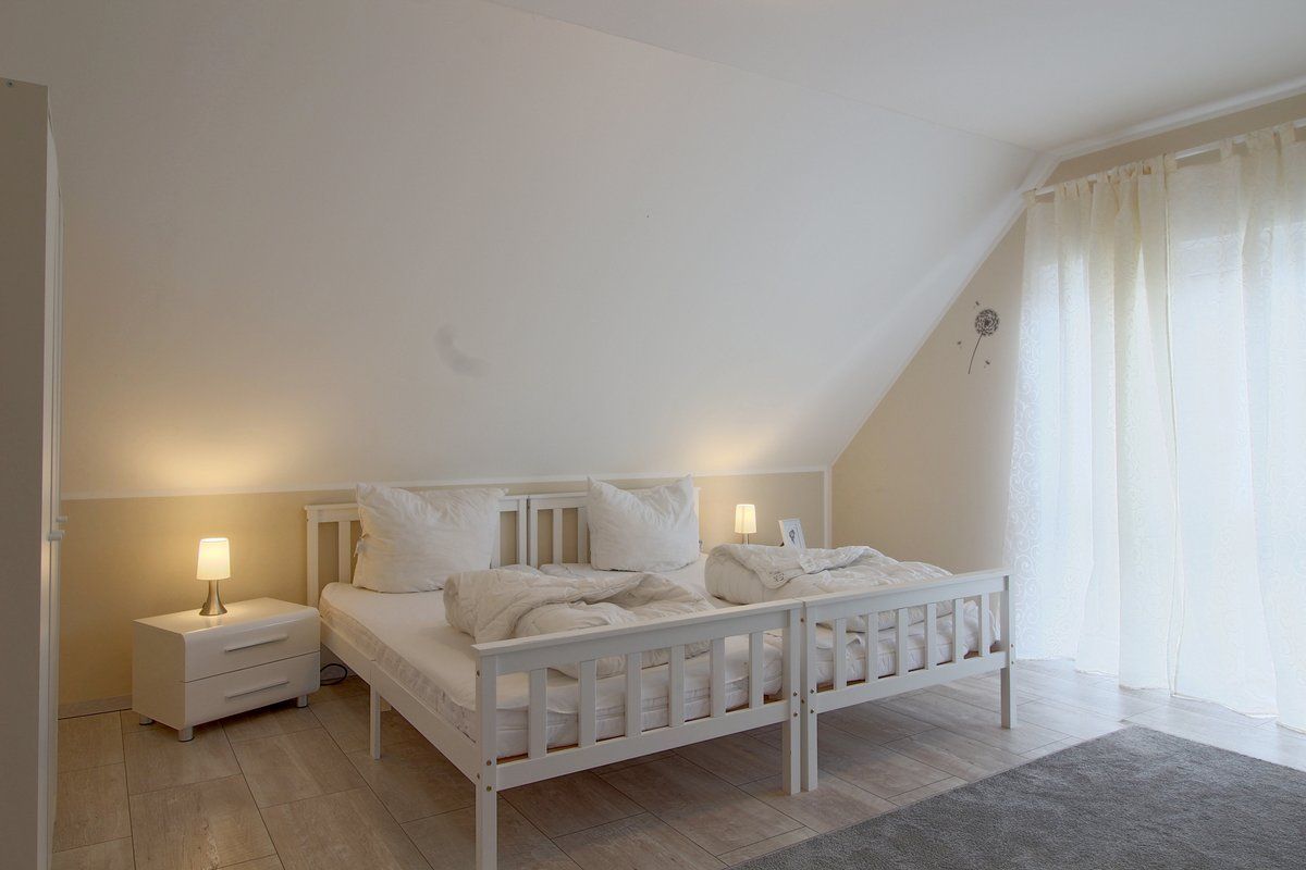 Im Obergeschoss befinden sich zwei geräumige Schlafzimmer und ein WC mit Waschbecken. Ein Schlafzimmer mit Doppelbett und Babyreisebett für ein Kleinkind und ein weiteres Schlafzimmer mit 2 Einzelbetten