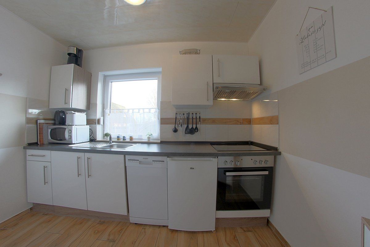 Im komplett gefliesten Erdgeschoss gibt es einen offenen Wohn- Essbereich mit Flat-TV, kostenloses W-Lan und Ausgang zur Terrasse, sowie eine separate Küche mit perfekt ausgestatteter moderner Einbauküche mit Geschirrspüler.