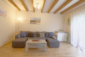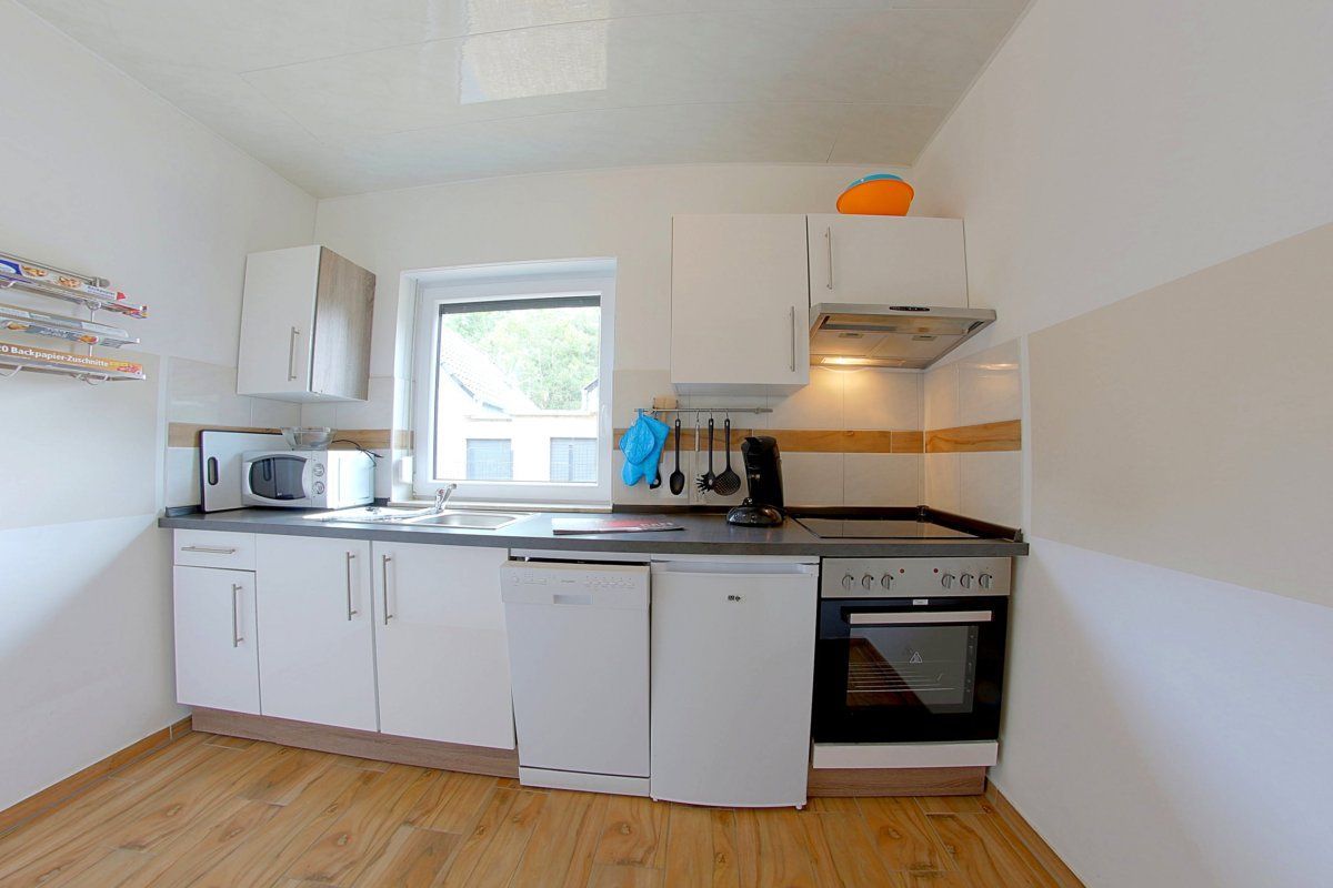 Im komplett gefliesten Erdgeschoss gibt es einen offenen Wohn- Essbereich mit Flat-TV, kostenloses W-Lan und Ausgang zur Terrasse, sowie eine separate Küche mit perfekt ausgestatteter moderner Einbauküche mit Geschirrspüler.