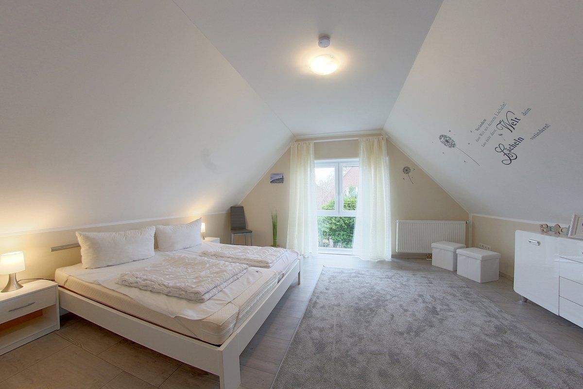 Im Obergeschoss befinden sich zwei geräumige Schlafzimmer und ein WC mit Waschbecken. Ein Schlafzimmer mit Doppelbett und Babyreisebett für ein Kleinkind und ein weiteres Schlafzimmer mit 2 Einzelbetten