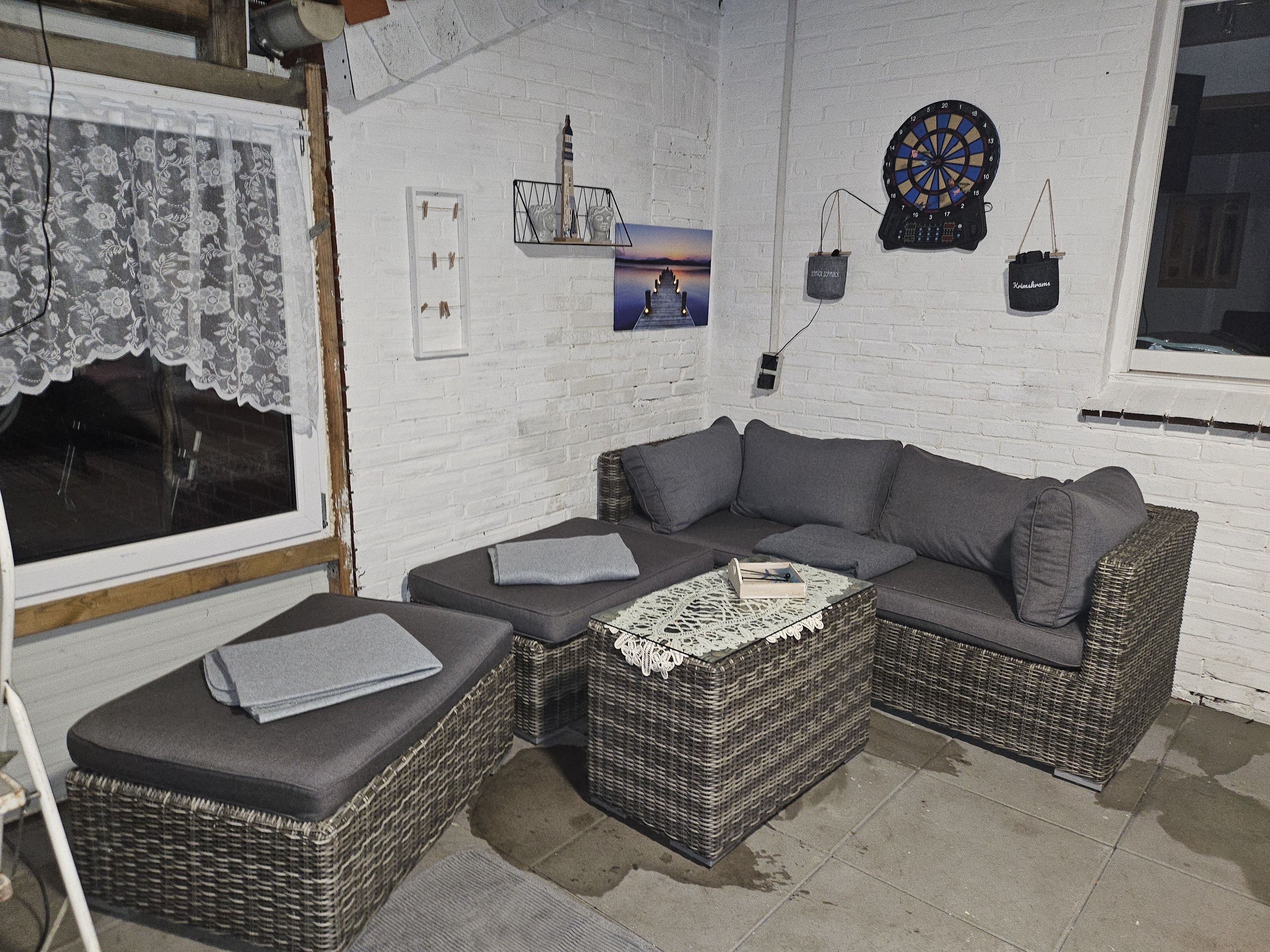In einem rustikalem Wintergarten können sie Darten sowie Kickern.
