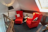 Die ca. 104 qm2 große Wohnung Störtebecker liegt im vorderenTeil des Hauses. Im urigen Wohn- und Kochbereich im Erdgeschoss ist das historische Balkenkonstrukt erhalten worden. Echte Wohlfühlatmosphäre schaffen der Kaminofen und die Empore mit Ausblick über die Wiesen und Weiden der Umgebung.