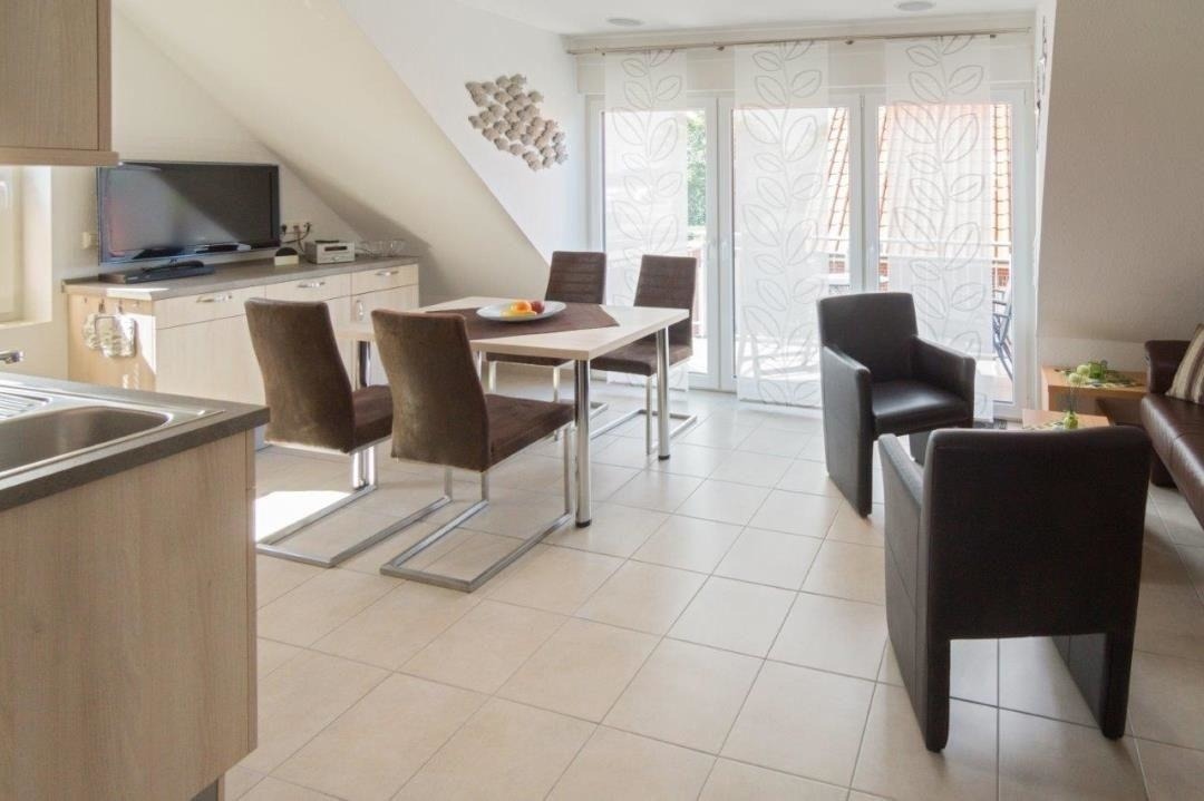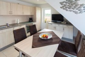 Der zeitlose Wohnraum der zentral gelegenen Ferienwohnung Strandlilie lädt zum Zusammenkommen und Entspannen ein. Eine bequeme Ledercouch und zwei Sessel bieten Ihnen ausreichend Plätze zum Verweilen. Ein kleiner Tisch und ein Flachbildfernseher (SAT-TV) mit DVD-Spieler runden die Möblierung im Wohnbereich stimmig ab.