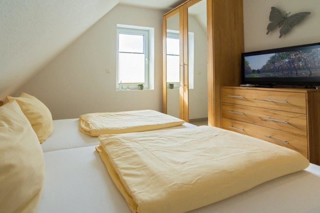 Ein Fernseher steht auch im zweiten Schlafraum bereit.
