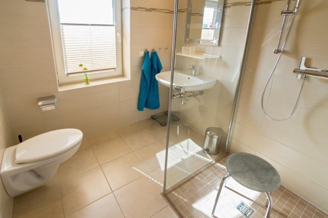 Die bodenebene, moderne Glasdusche sorgt auch im Badezimmer für Komfort. Fußbodenheizung und Handtuchtrockner unterstreichen diesen Eindruck zusätzlich. Waschbecken, Hänge-WC und Kosmetikspiegel warten ebenso wie ein Haartrockner ebenfalls im Badezimmer auf Sie.