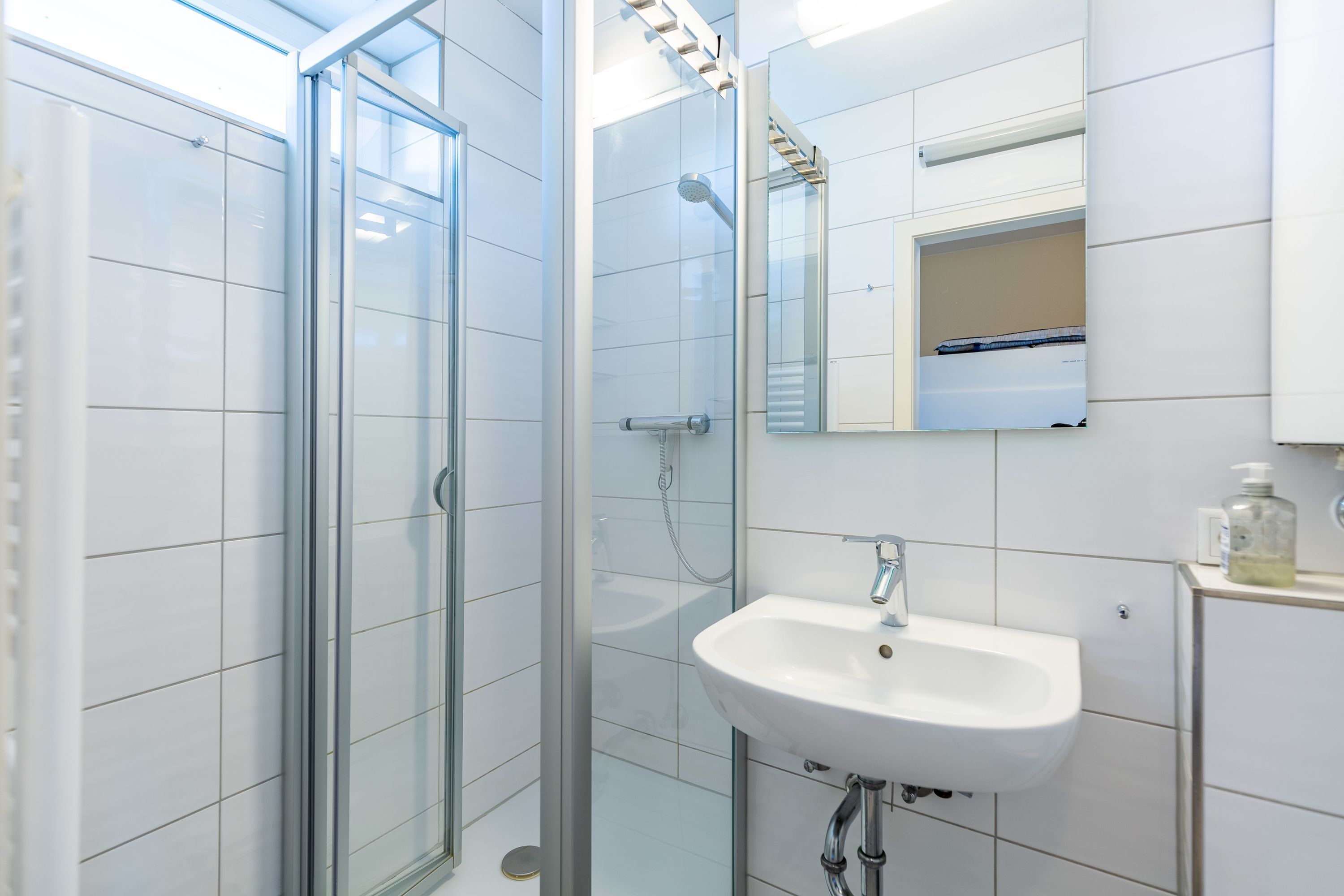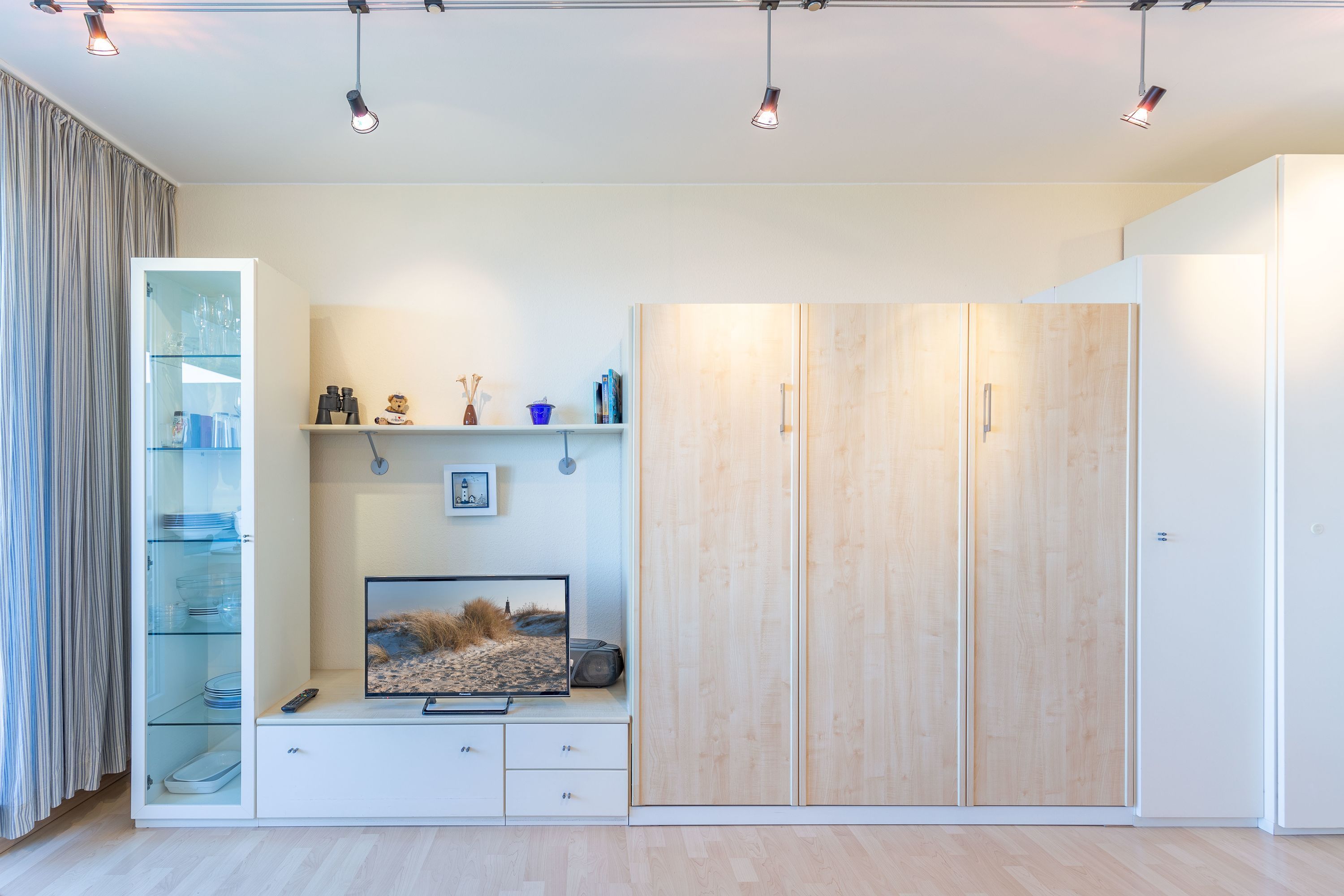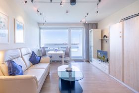 Der kombinierte Wohn- und Schlafbereich ist vollständig möbliert. Die integrierte Küchenzeile ist mit einem Ceranfeld (4 Kochstellen), einer Kaffeemaschine sowie den üblichen Küchenutensilien ausgestattet. Das komfortable Schrankbett mit einer Liegefläche von 160 cm ist mit zwei getrennten Taschenfederkernmatratzen ausgestattet. Das Bad mit Dusche und WC verfügt über ein Fenster zum Belüften. Auch vom Balkon genießen Sie den traumhaften Meerblick. Ein KFZ-Stellplatz ist vorhanden, sowie kostenloses WLAN.