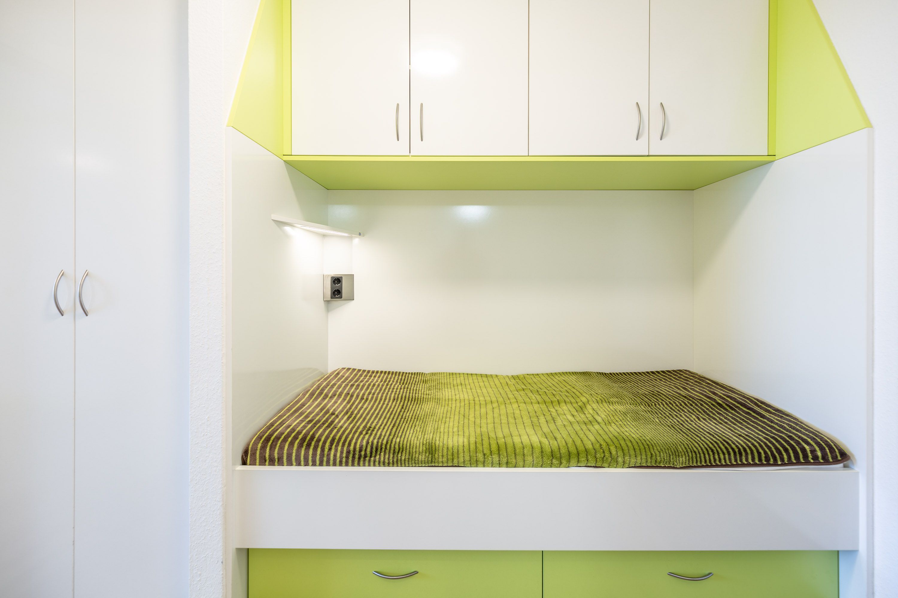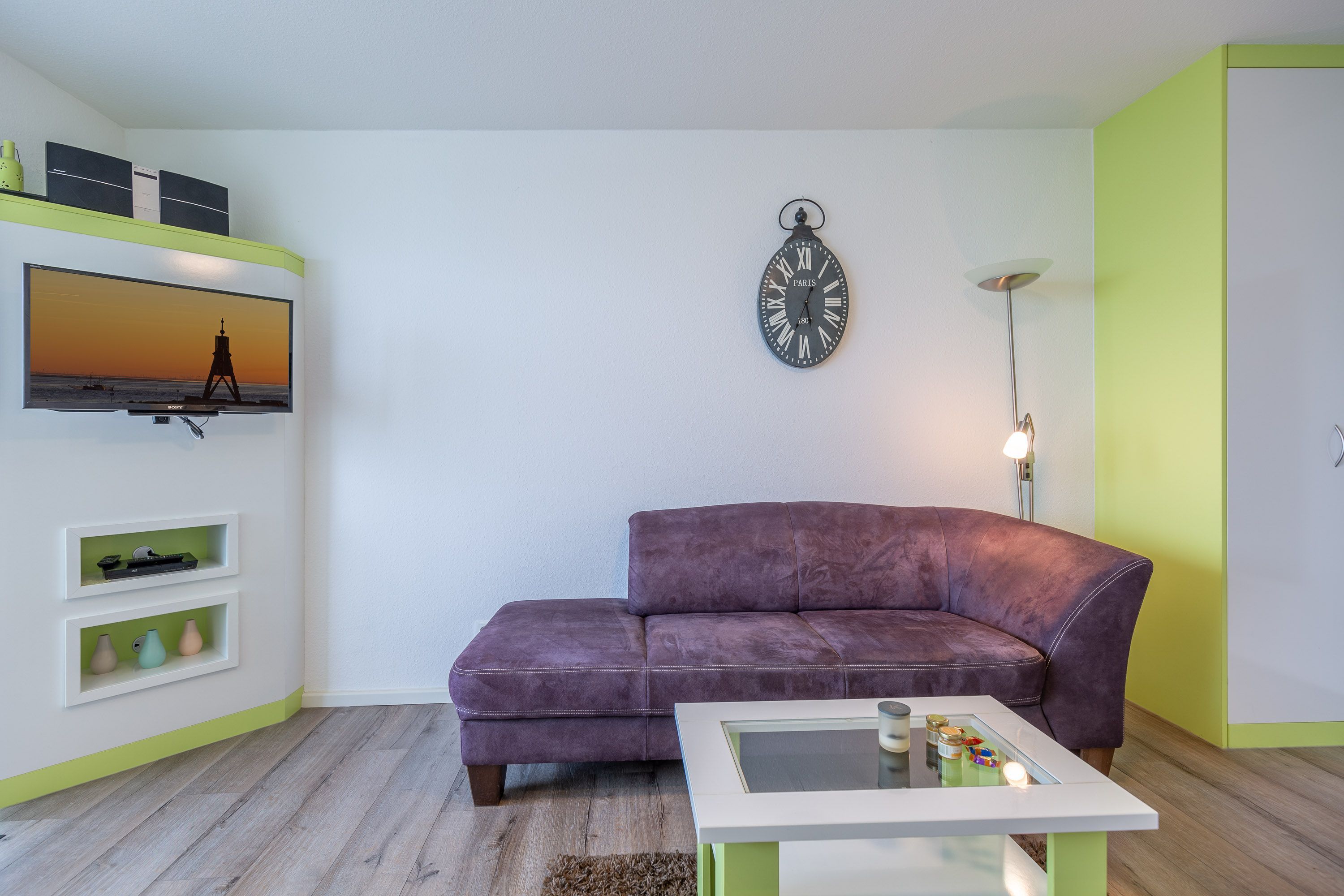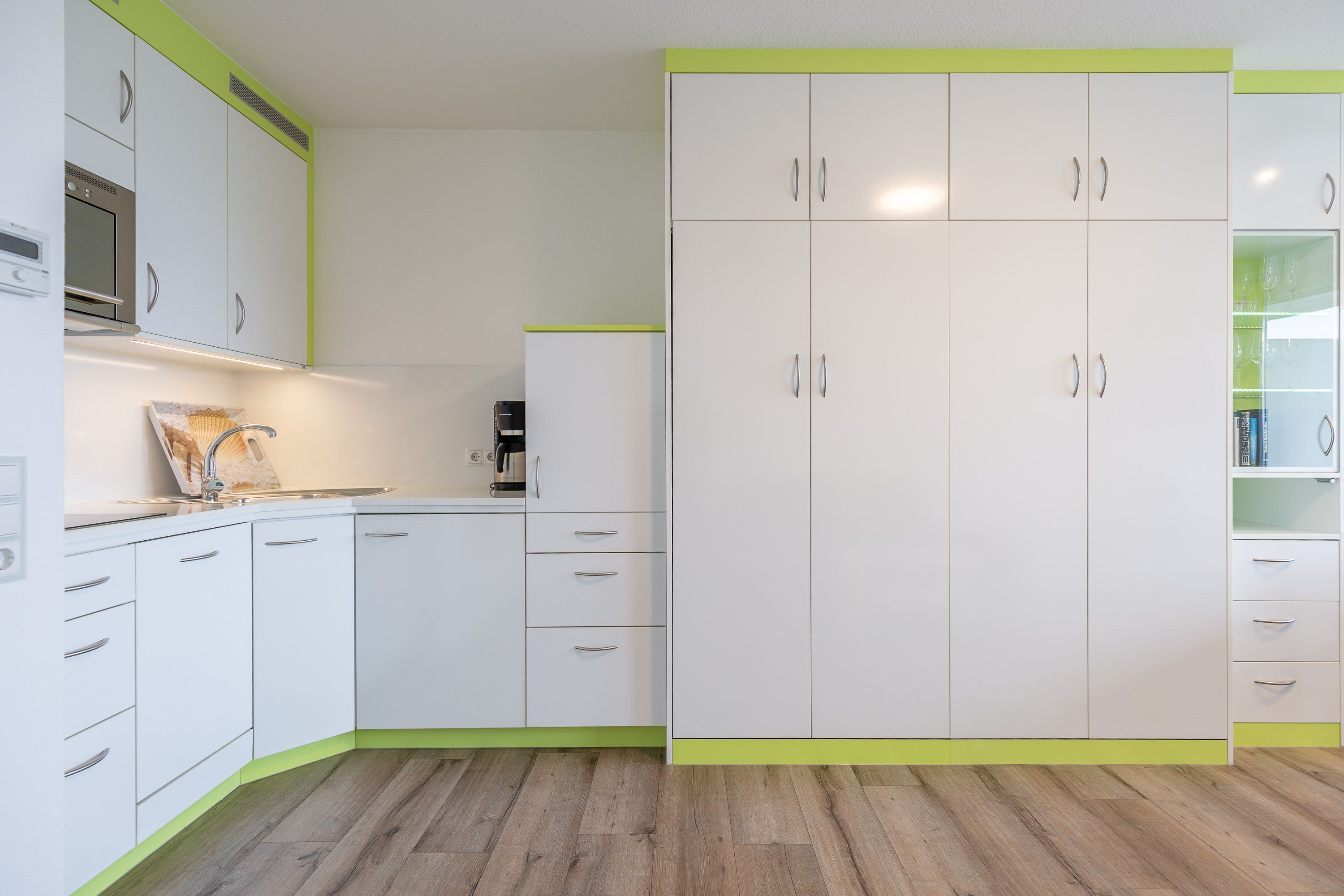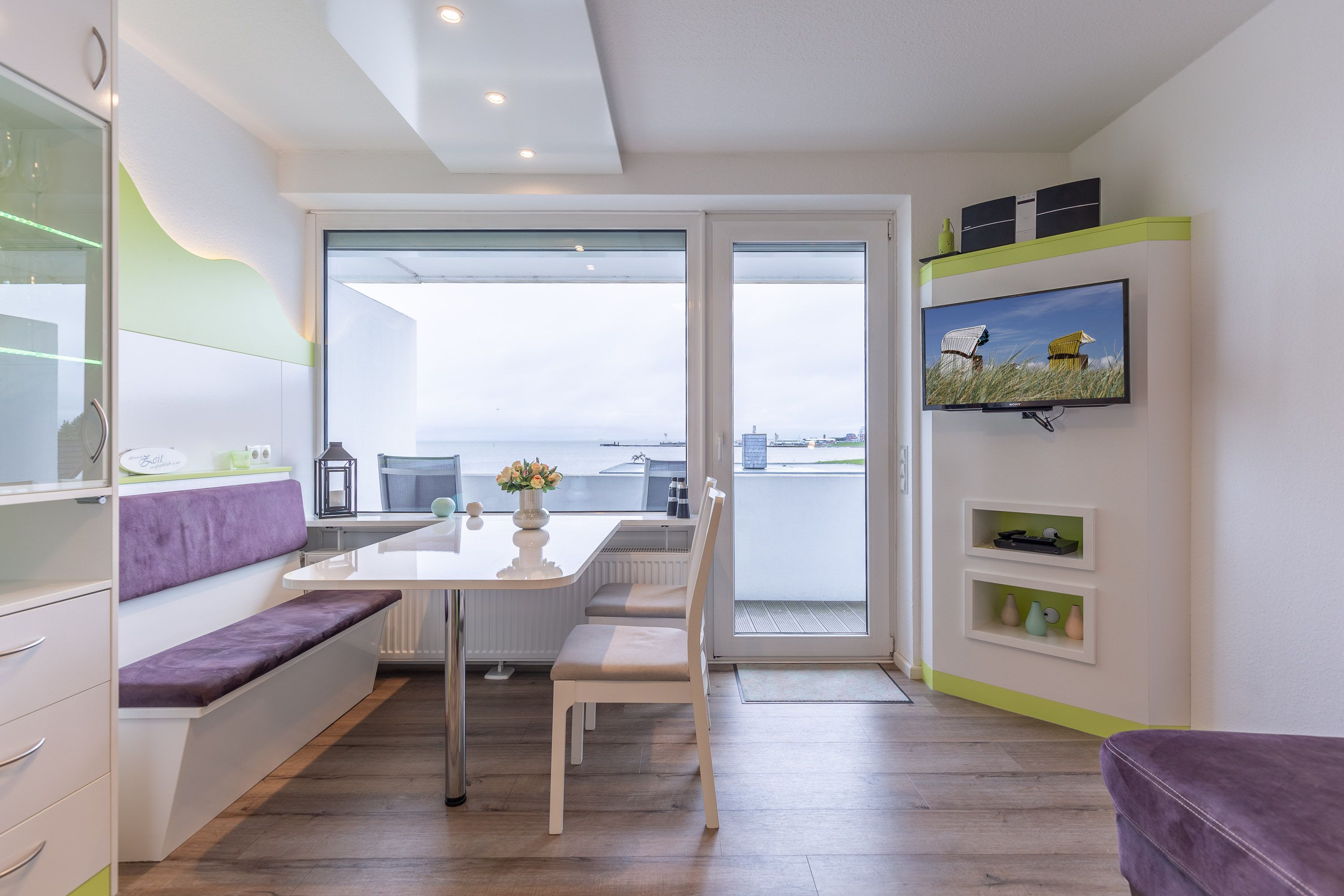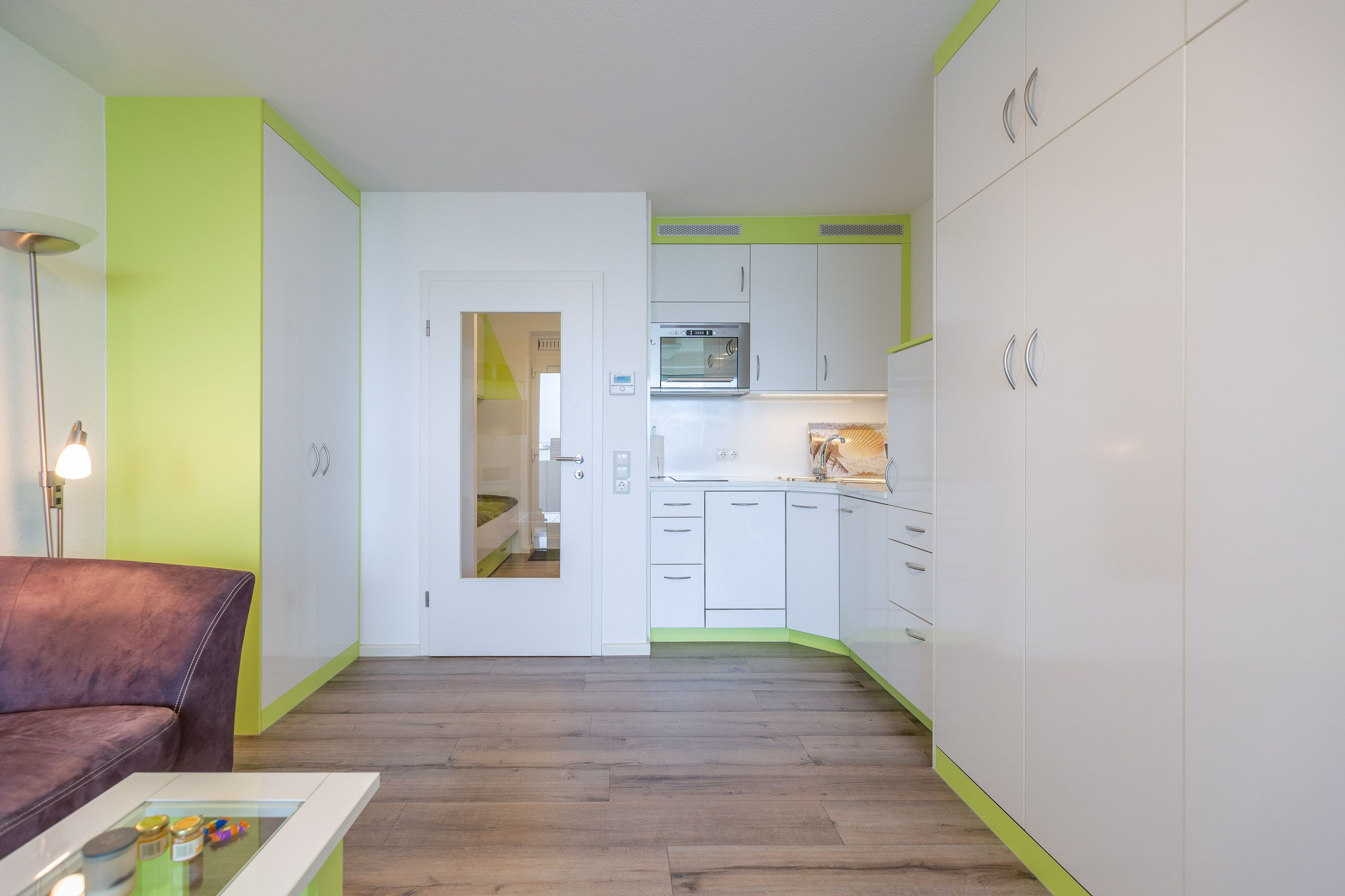 Die hochwertigen Schrankbetten lassen sich getrennt nutzen. Ein separates Einzelbett im Vorraum bietet eine vom Wohnbereich getrennte Schlafmöglichkeit. Eine integrierte Küche mit Geschirrspüler und ein Flachbildfernseher gehören zum Standard. Zur Wohnung gehört ein meerseitiger Balkon. Ferienwohnung 402 ist mit einem modernen Bad mit Dusche, WC und einem Fenster zum Belüften ausgestattet.