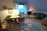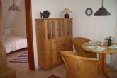 Zu dieser freundlichen Wohnung im ersten Stock mit 30 qm Wohnfläche gehört ein großer Balkon mit herrlichem Blick auf Wiesen, Deich und den früheren Halligleuchtturm. Sie hat ein kleines separates Schlafzimmer mit 160 cm Doppelbett und einen Wohnraum mit Sofa, einem Kojenbett, Sitzecke und einer Küchenzeile. Die Wohnung hat Platz für zwei bis drei Personen.