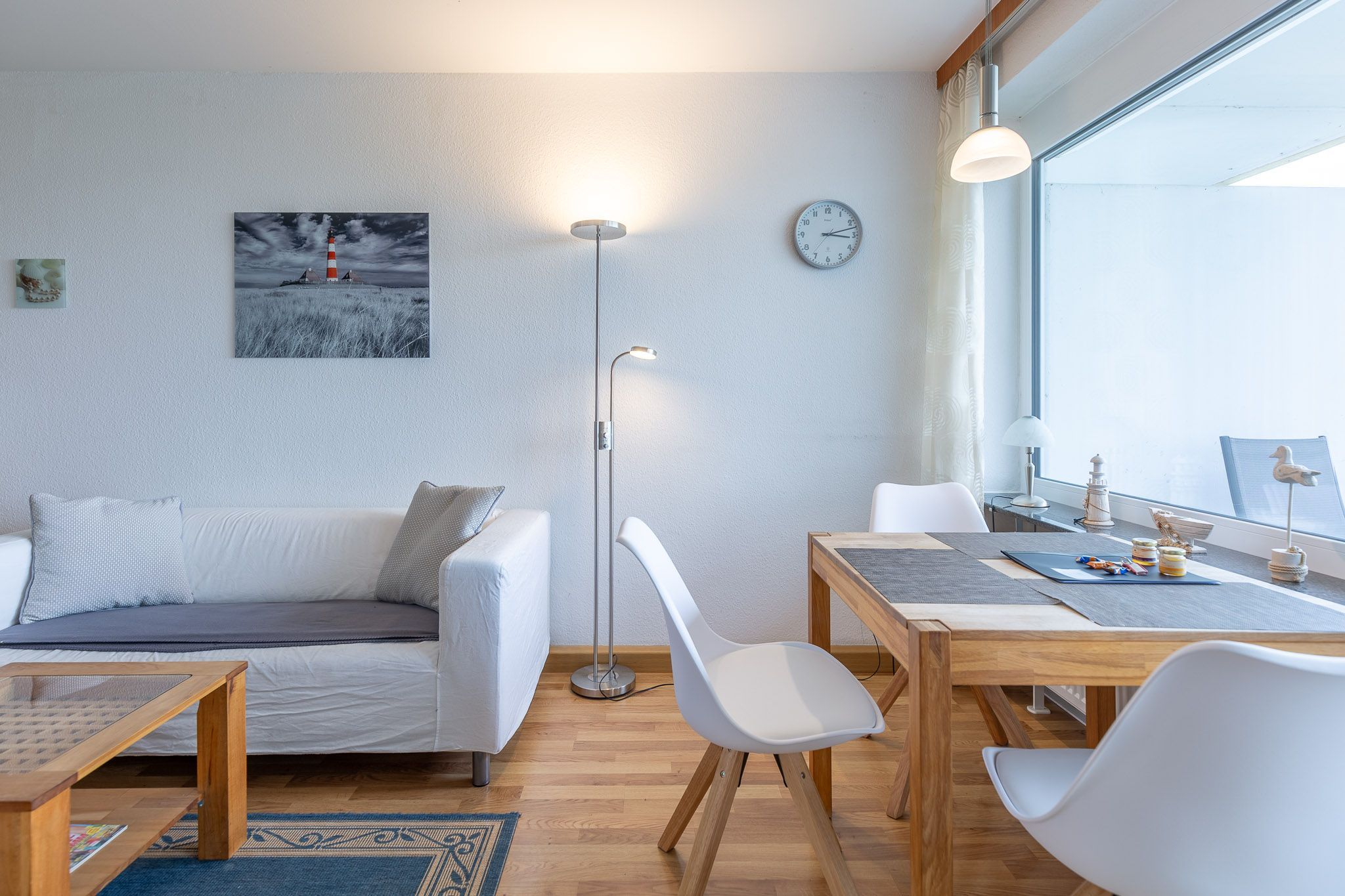 Der Esstisch am Fenster gewährleistet, dass Sie schon beim allmorgendlichen Kaffee den faszinierenden Meerblick auf die vorbeifahrenden Großsegler, Kutter und Kreuzfahrtschiffe genießen können. Ein LCD Fernseher sorgt dafür, dass Sie auch im Urlaub nicht auf Ihre Lieblingsserie verzichten müssen. Eine Küchenzeile ist im Wohnbereich integriert.