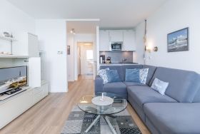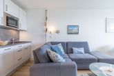 Der kombinierte Wohn-/Essbereich bietet eine Küchenzeile mit Geschirrspüler, 2-Platten-Ceranfeld sowie Mikrowelle mit Crisp-Funktion. Auf dem Ecksofa können Sie sich entspannt zurücklehnen und den atemberaubenden Meerblick genießen. Krabbenkutter und Kreuzfahrtschiffe sind zum Greifen nah. Für beste Unterhaltung sorgt neben dem abwechslungsreichen Ausblick auch ein LCD Fernseher.