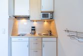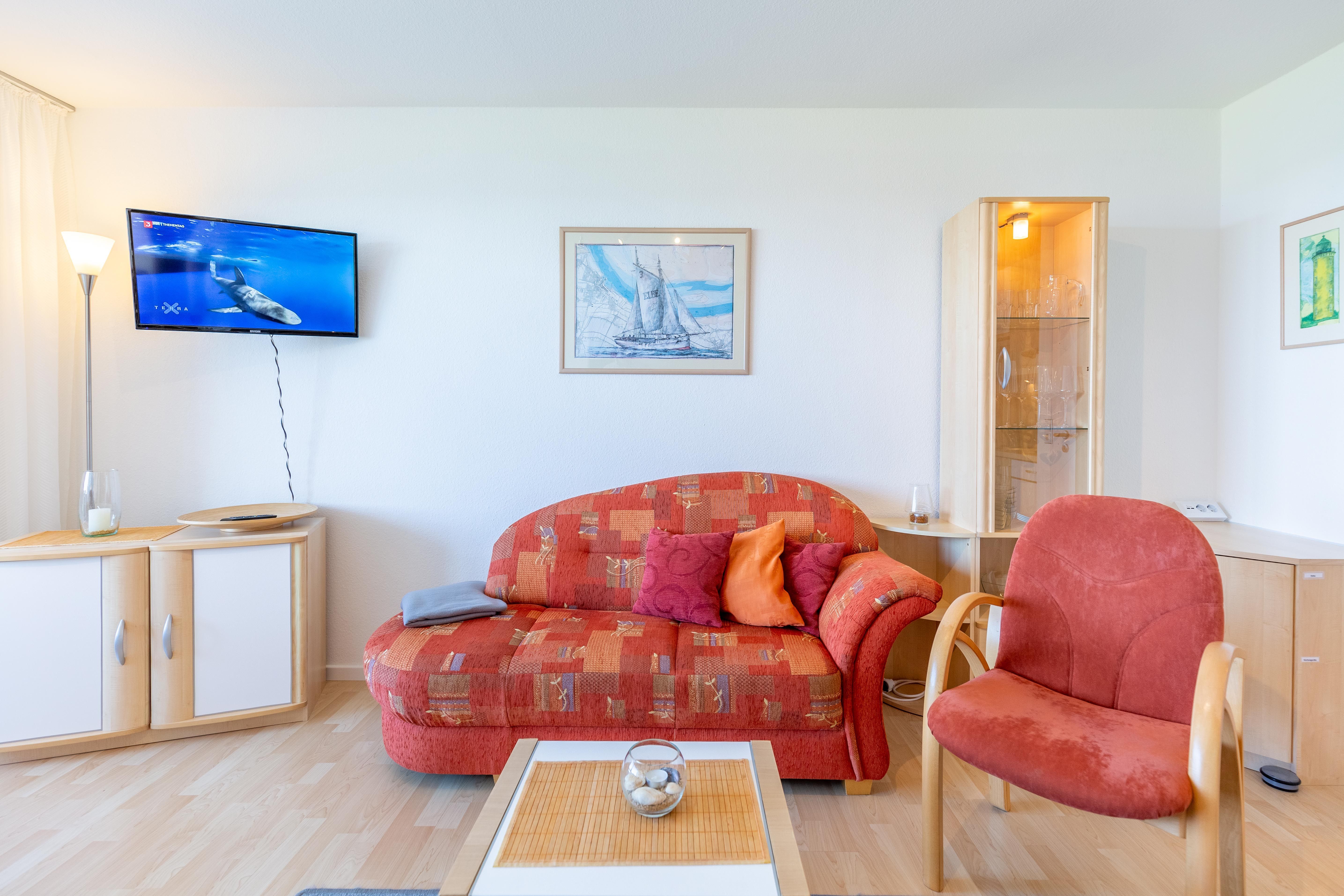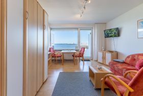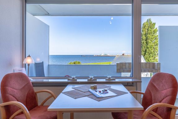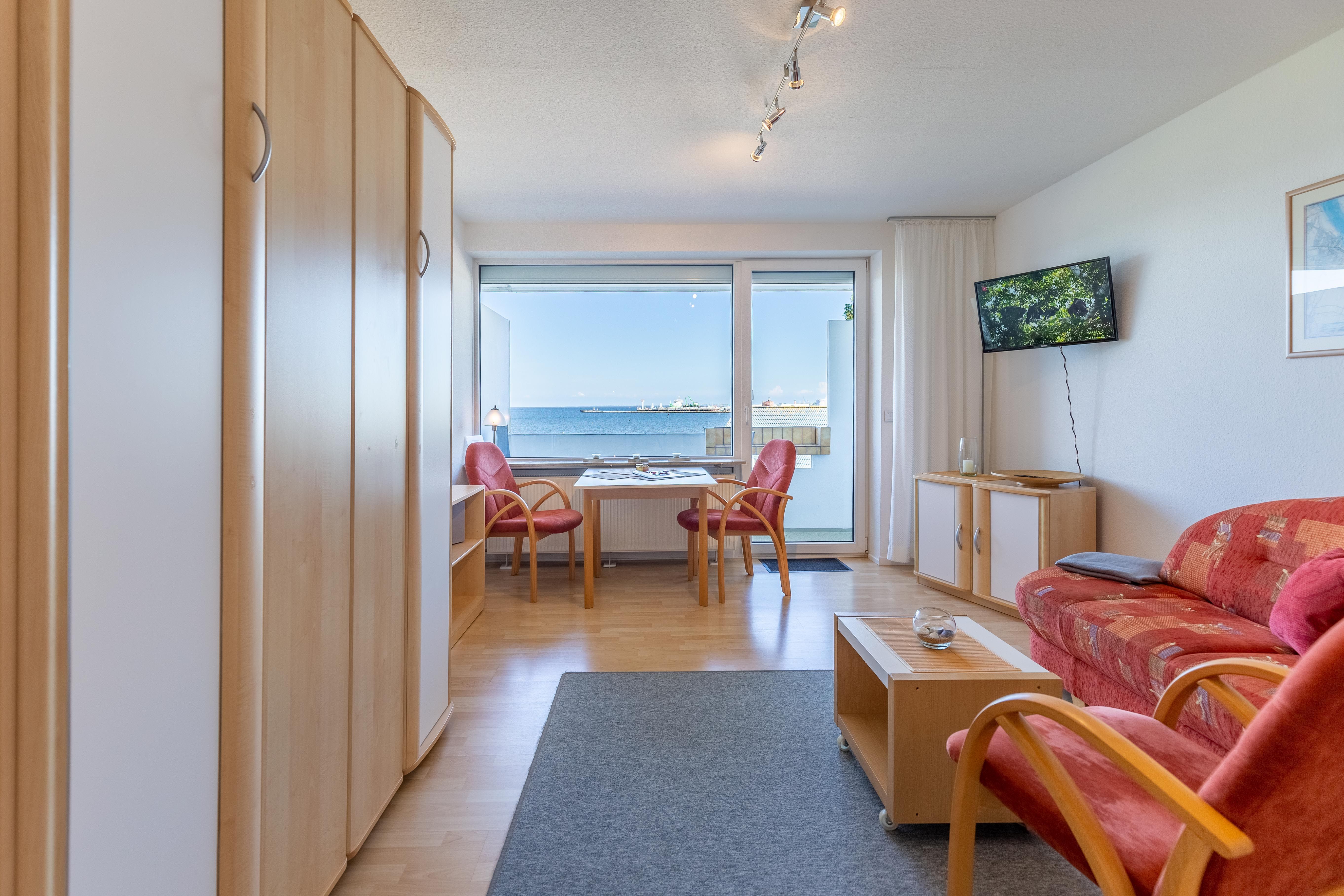 Am Morgen die erste Tasse Tee bei traumhaftem Meerblick genießen oder am Abend die malerische Kulisse des beleuchteten Hafen bestaunen. In unserer 35 m² großen Ferienwohnung mit Meerblick erleben Sie unvergessliche Urlaubsstunden. Warme Farben sorgen für ein einladendes und gemütliches Ambiente. Nach einem erlebnisreichen Tag können Sie in den komfortablen Armlehnstühlen entspannen und die Parade der vorbeiziehenden Segelschiffe, Krabbenkutter und Luxus Liner beobachten. Eine kleine, komplett ausgestattete Küchenzeile ist im Wohnbereich integriert.