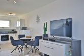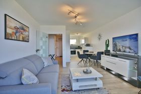 Genießen Sie die schönsten Tage des Jahres in unserer 59 m² Ferienwohnung. Optimal für 2 bis 3 Personen. Nach einem erlebnisreichen Tag können Sie den Abend auf dem bequemen Sofa ausklingen lassen. Der Flachbildfernseher sorgt dafür, dass Sie auch im Urlaub nicht auf Ihre Lieblingsserie verzichten müssen. Die moderne und offen gehaltene Küche ist mit einem Backofen und einem Geschirrspüler sowie einem Kühlschrank mit Gefrierfach ausgestattet.