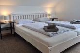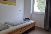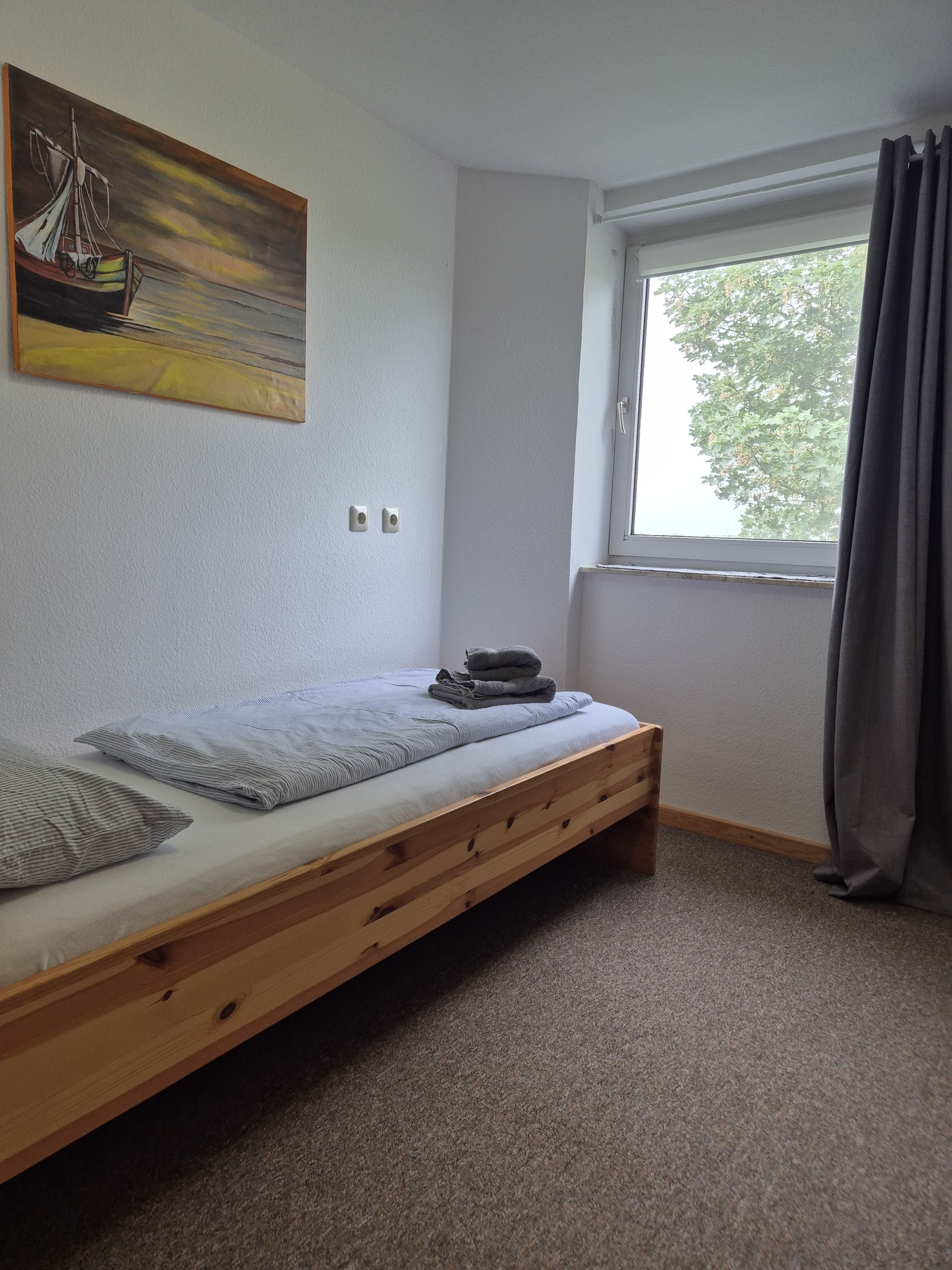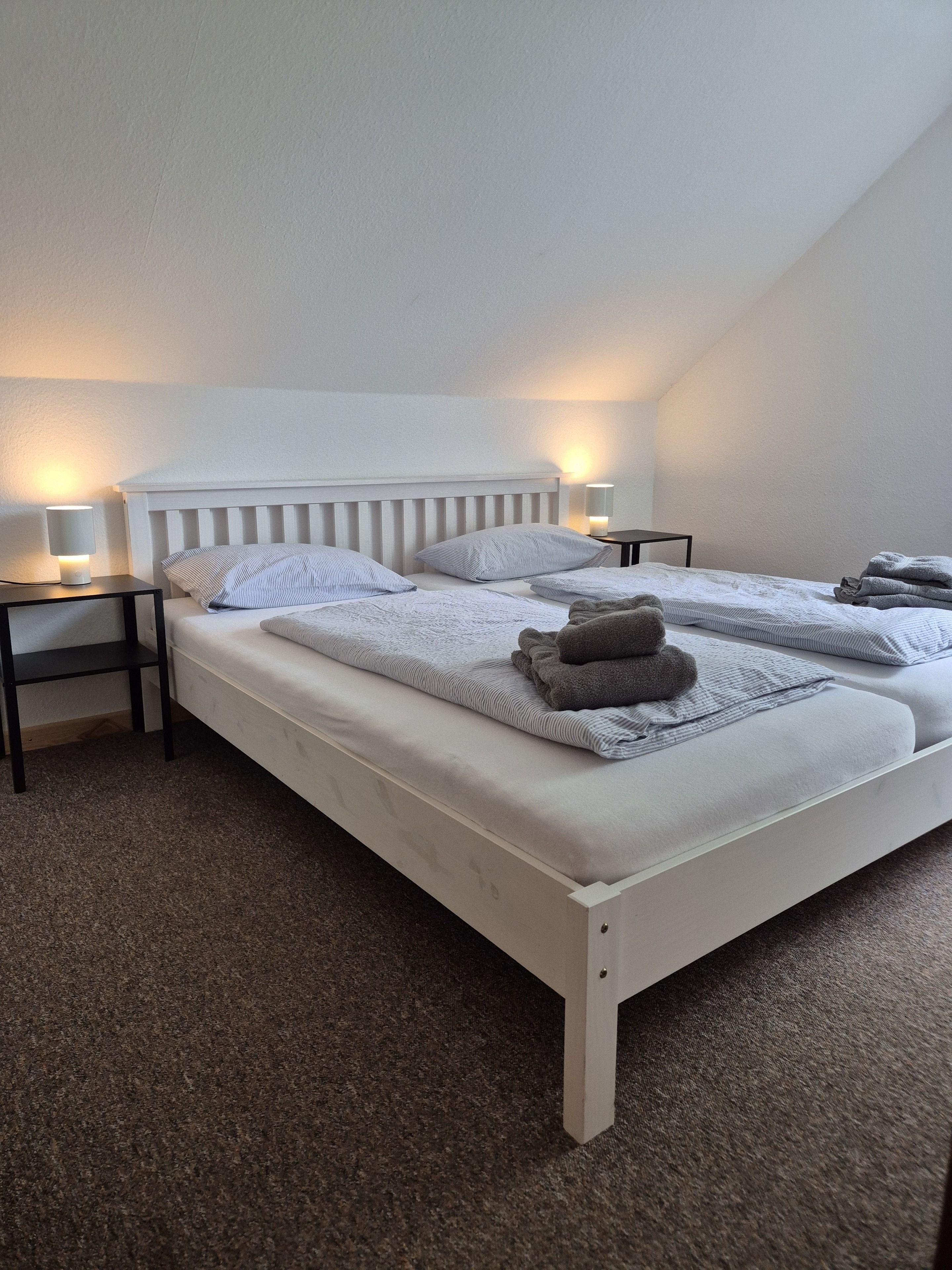 Die Ferienwohnung verfügt über zwei Schlafzimmer, eines mit einem komfortablen Doppelbett und das andere mit zwei Einzelbetten. Beide Zimmer bieten ausreichend Stauraum für Ihre Kleidung und persönlichen Gegenstände. Das Badezimmer ist mit einer Dusche, einem Waschbecken und einem WC ausgestattet.