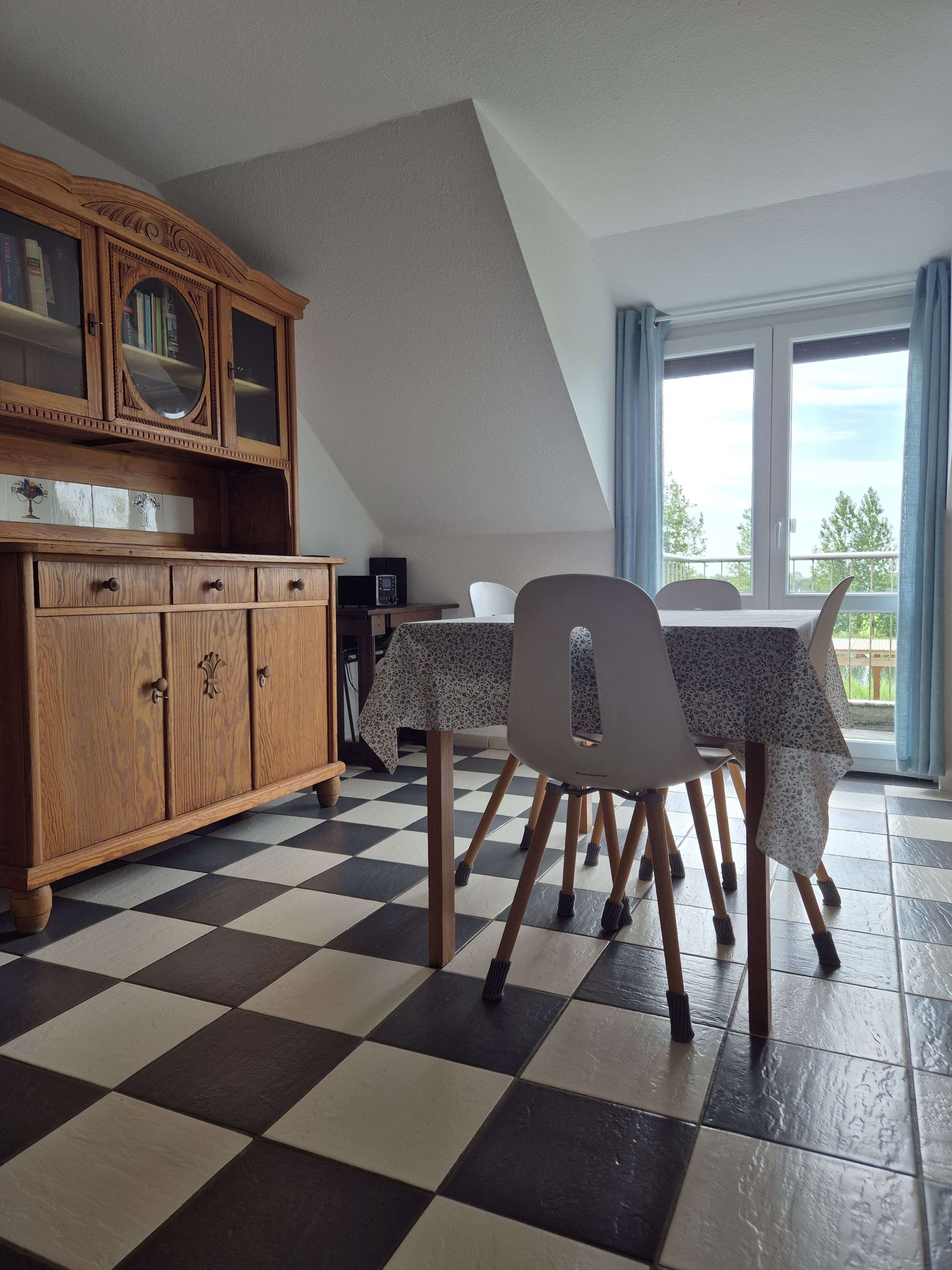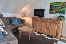 Beim Betreten der Wohnung gelangen Sie über den Flur in den gemütlichen Wohnbereich, der mit einer bequemen Couch und einem Flachbildfernseher ausgestattet ist. Von hier aus haben Sie Zugang zum Balkon, auf dem Sie die malerische Umgebung und die frische Luft genießen können.