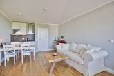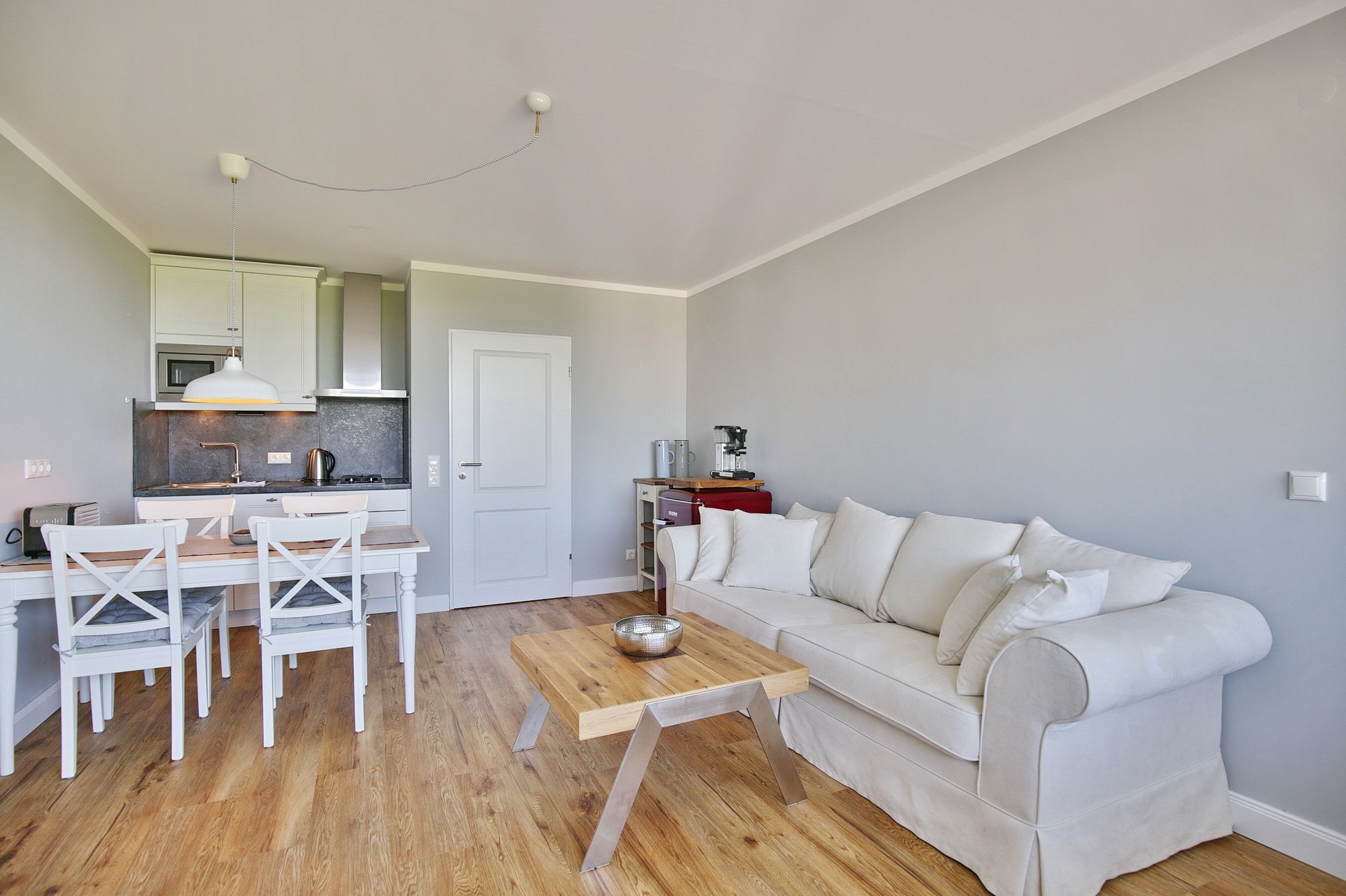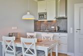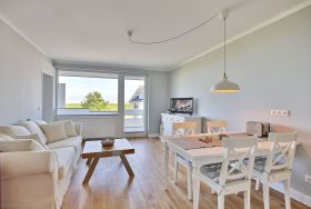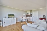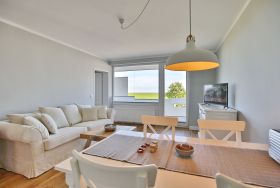 Der kombinierte Wohn-/Essbereich bietet eine kleine Küchenzeile mit einem 2-Platten Gasherd, einem Geschirrspüler und einem Kühlschrank mit Gefrierfach. Auf dem Sofa können Sie sich entspannt zurücklehnen und den Meerblick genießen. Für Unterhaltung sorgt neben dem abwechslungsreichen Ausblick auch ein Flachbildfernseher. Der Balkon ist bei gutem Wetter eine wahre Freiluft-Nordseeloge und ist sowohl vom Wohn- als auch vom Schlafzimmer begehbar. Selbstverständlich genießen Sie auch vom möblierten Balkon einen traumhaften Meerblick, der mehr als beeindruckt. Das modern sanierte Bad mit Dusche und WC verfügt über ein Fenster zum Belüften. Der Wohnung ist ein PKW-Stellplatz zugeordnet. Ihre Ferienwohnung in der 2. Etage erreichen Sie bequem mit dem Aufzug.