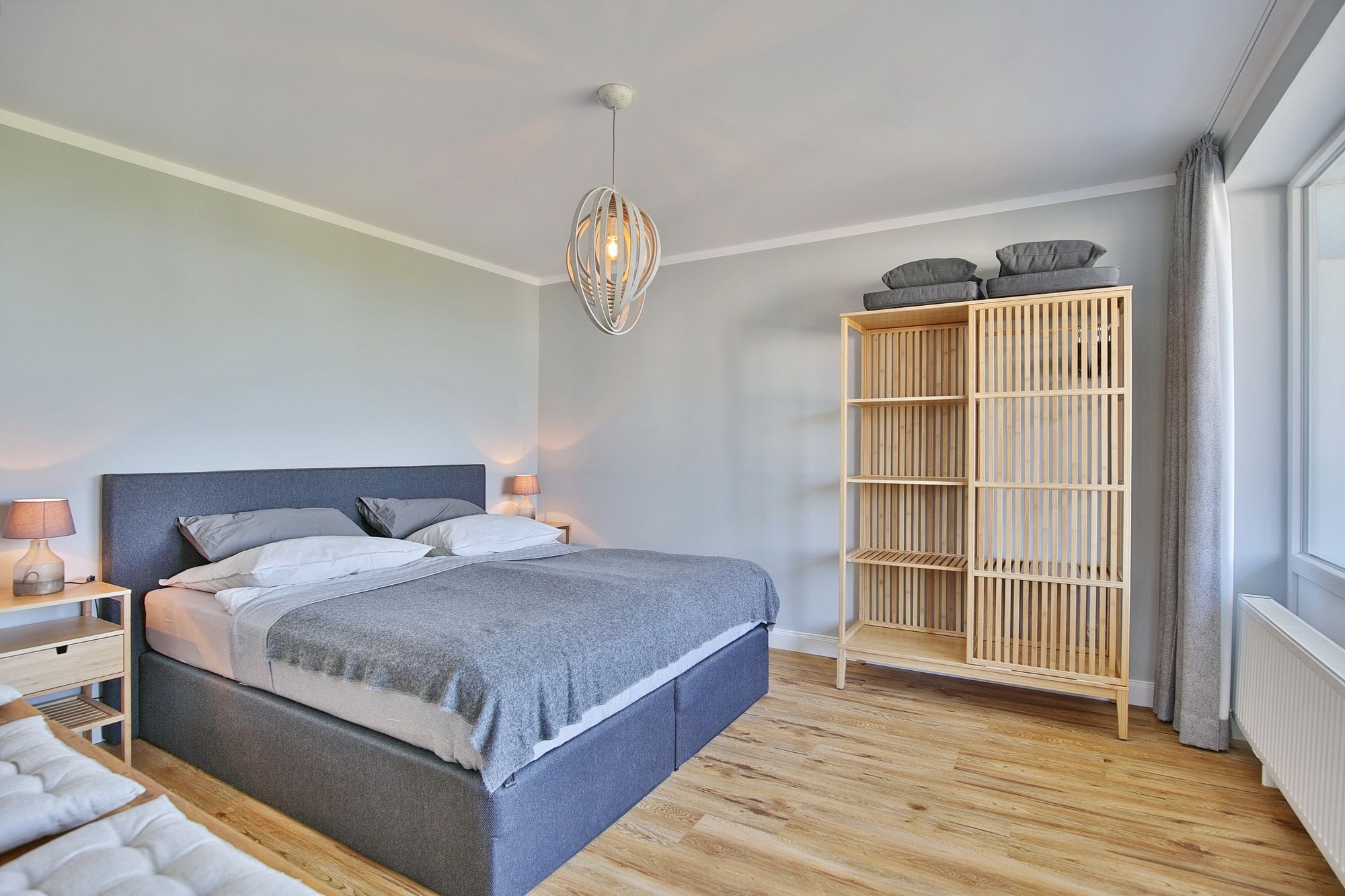 Ein separates Schlafzimmer mit komfortablem und großzügigem Boxspringbett (200x200 cm) sorgt für einen erholsamen Schlaf. Schiffchen anstatt Schäfchen zählen - schon vom Boxspringbett aus genießen Sie den atemraubenden Blick auf den Schifffahrtsweg. Derweil sorgen Verdunklungsvorhänge dafür, dass Sie nicht von der Morgensonne geweckt werden.