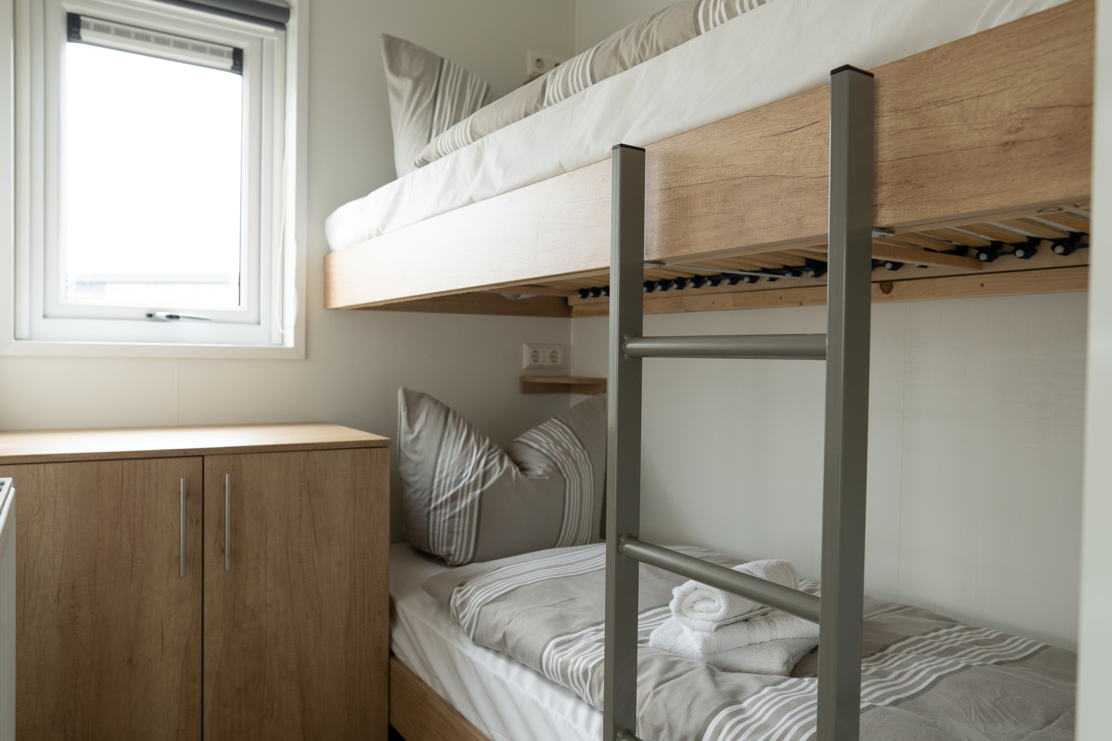 Ferienhaus mit rd. 52m² und Platz für bis zu sechs Personen. Drei Schlafzimmer (eins mit Doppelbett, eins mit zwei Einzelbetten und eins mit Etagenbett), ein Badezimmer, großer Wohnraum mit Küche, Sitzgelegenheiten und Unterhaltungsmedien (TV). Im Außenbereich gibt es einen Stellplatz für Ihr Auto und die Terrasse lädt zum gemütlichen Verweilen ein. Die Chalets befinden sich in einem eigenen Parkareal unseres Platzes mit eigener Zufahrt.