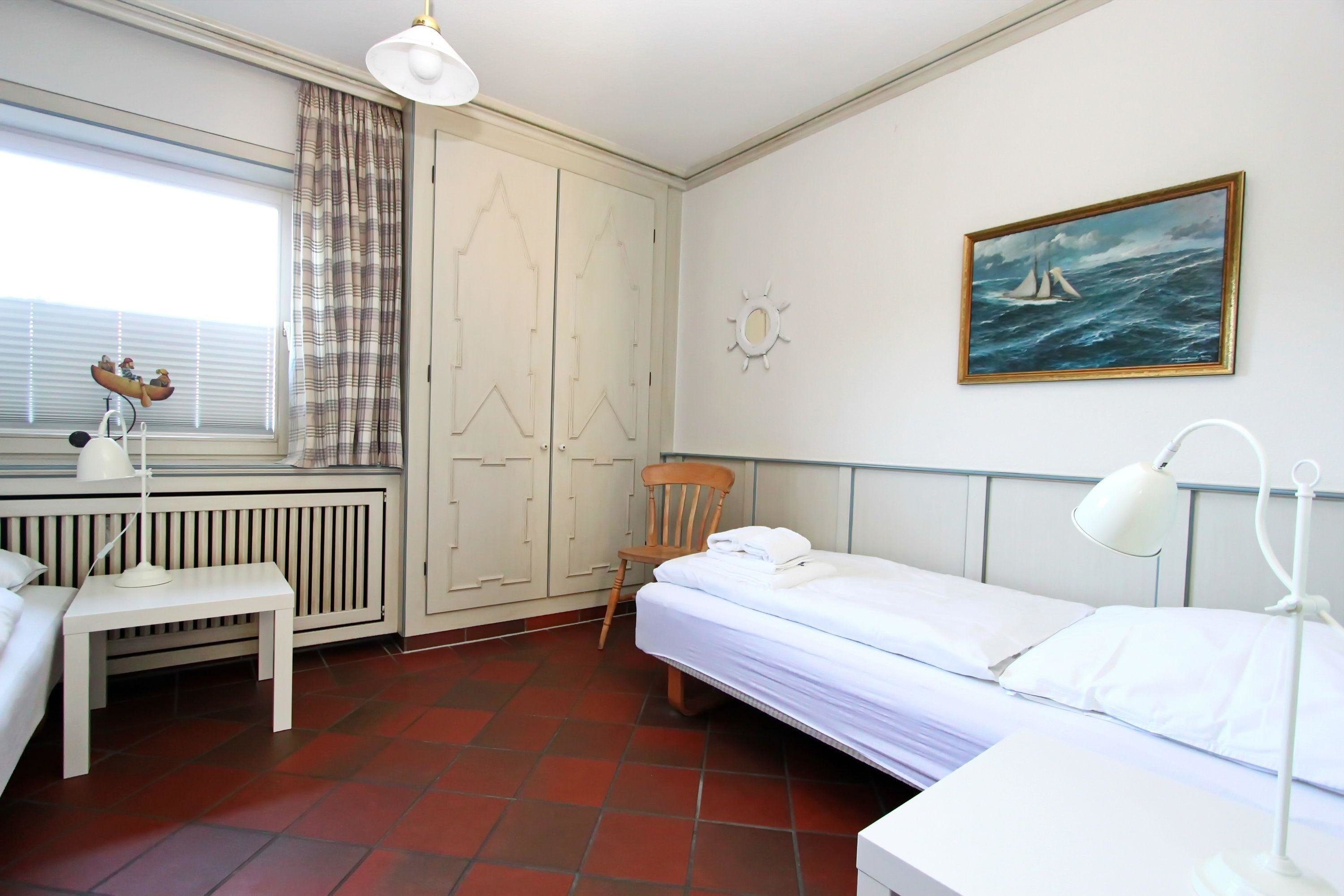 Die voll ausgestattete Küche verfügt über ein vier Platten Cerankochfeld, Geschirrspüler, Mikrowelle, Kühlschrank sowie alle Utensilien, die benötigt werden, um sich selbst zu versorgen. Vom Flur mit Garderobe geht ein Schlafzimmer ab. Dort stehen zwei Einzelbetten mit kleinen Nachttischen und ein großer Einbaukleiderschrank, der ausreichend Stauraum bietet. Vom Wohnzimmer gelangen Sie über eine Treppe ins Untergeschoss. Dort befindet sich neben dem Duschbad/WC der zweite Schlafraum. Dieser verfügt über ein Doppelbett, Nachttische und ein Fenster. Durch den Lichtschacht kommt Tageslicht hinein. Im Flur sind ebenfalls Einbauschränke. Vom vorderen Hauseingang kommen Sie in den Wellnessbereich mit einem Schwimmbad und Sauna (gegen Gebühr).