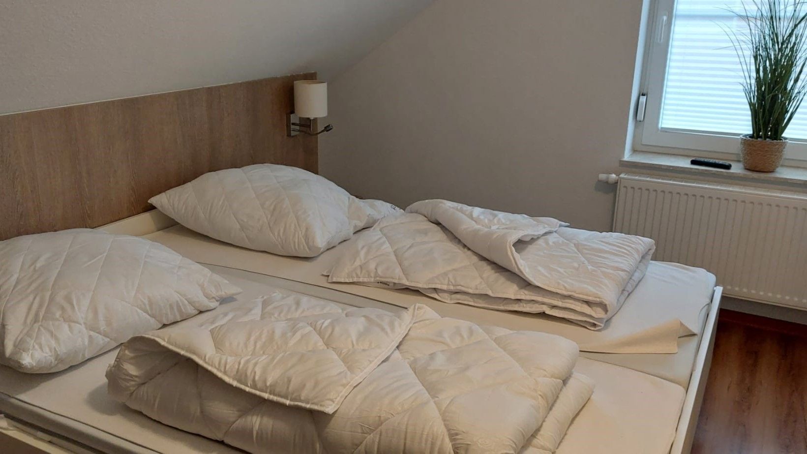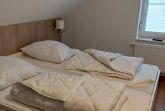 Im Obergeschoss befinden sich drei Schlafzimmer: Das Elternschlafzimmer verfügt über ein Doppelbett mit neuen Matratzen und verstellbaren Lattenrosten sowie einen 42-Zoll-Fernseher. Ein weiteres Zimmer bietet zwei Boxspringbetten und TV, das dritte ein Einzelbett mit ausziehbarem Unterschubbett und ebenfalls einen Fernseher. Außenrollos und Fliegengitter an den Fenstern sorgen für erholsame Nächte.