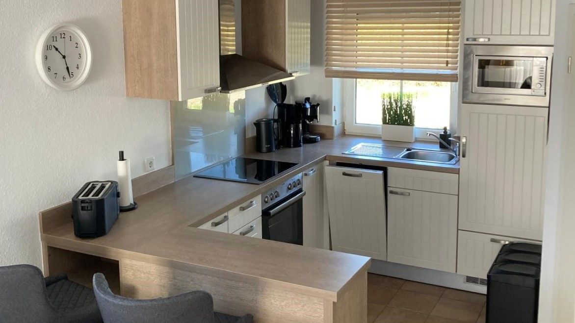 Die voll ausgestattete Landhausküche bietet alles, was Sie brauchen: Cerankochfeld, Backofen, Mikrowelle, Kühlschrank, Spülmaschine, Senseo- und Filterkaffeemaschine, Wasserkocher, Toaster und Sandwichmaker. Fliegengitter an der Terrassentür und am Esszimmerfenster sorgen für ungestörte Mahlzeiten.