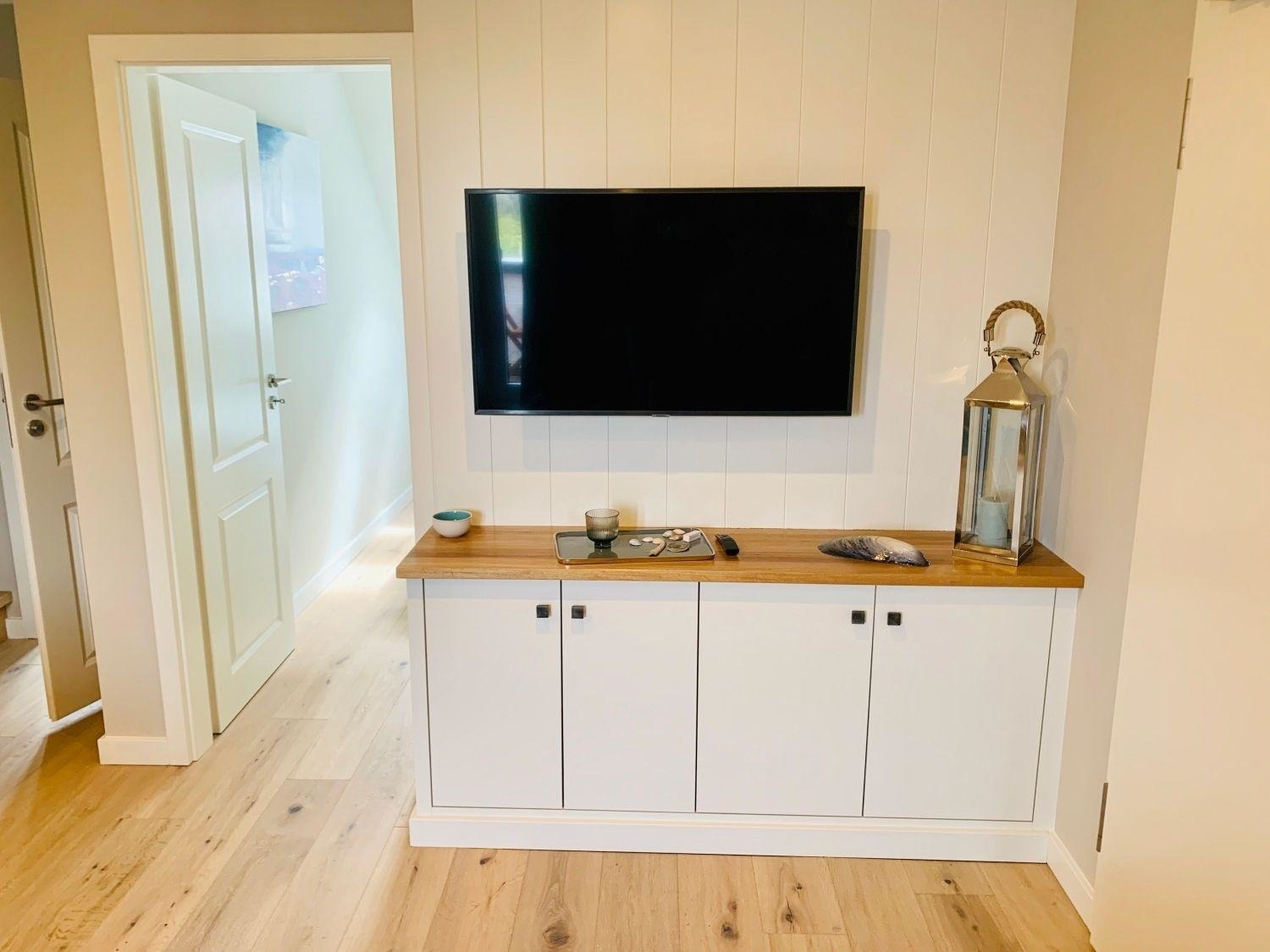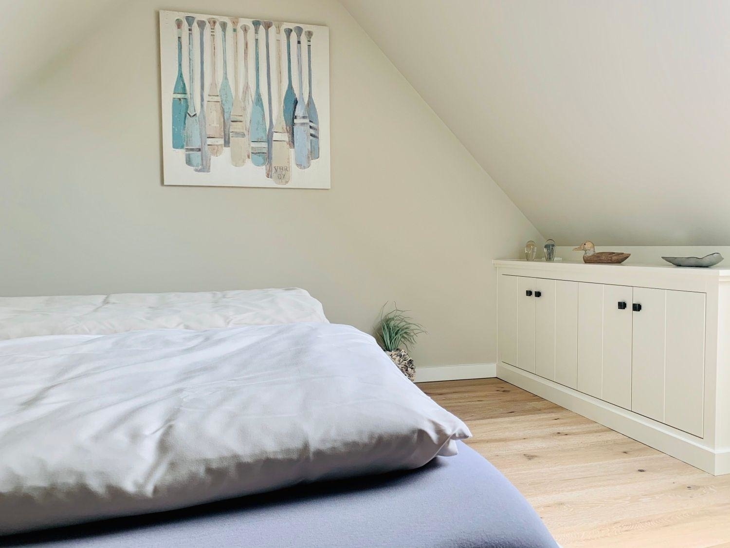 Vom Flur aus gehen Schlafzimmer mit Doppelbett, das Bad und das Wohnzimmer mit Westbalkon ab. Das weitere Schlafzimmer mit Doppelbett erreichen Sie durch die interne Treppe nach oben. Der Küchenbereich ist als moderne Küchenzeile in das Wohnzimmer integriert.
