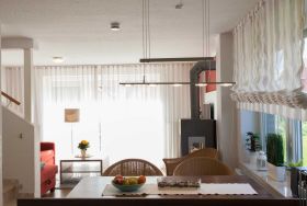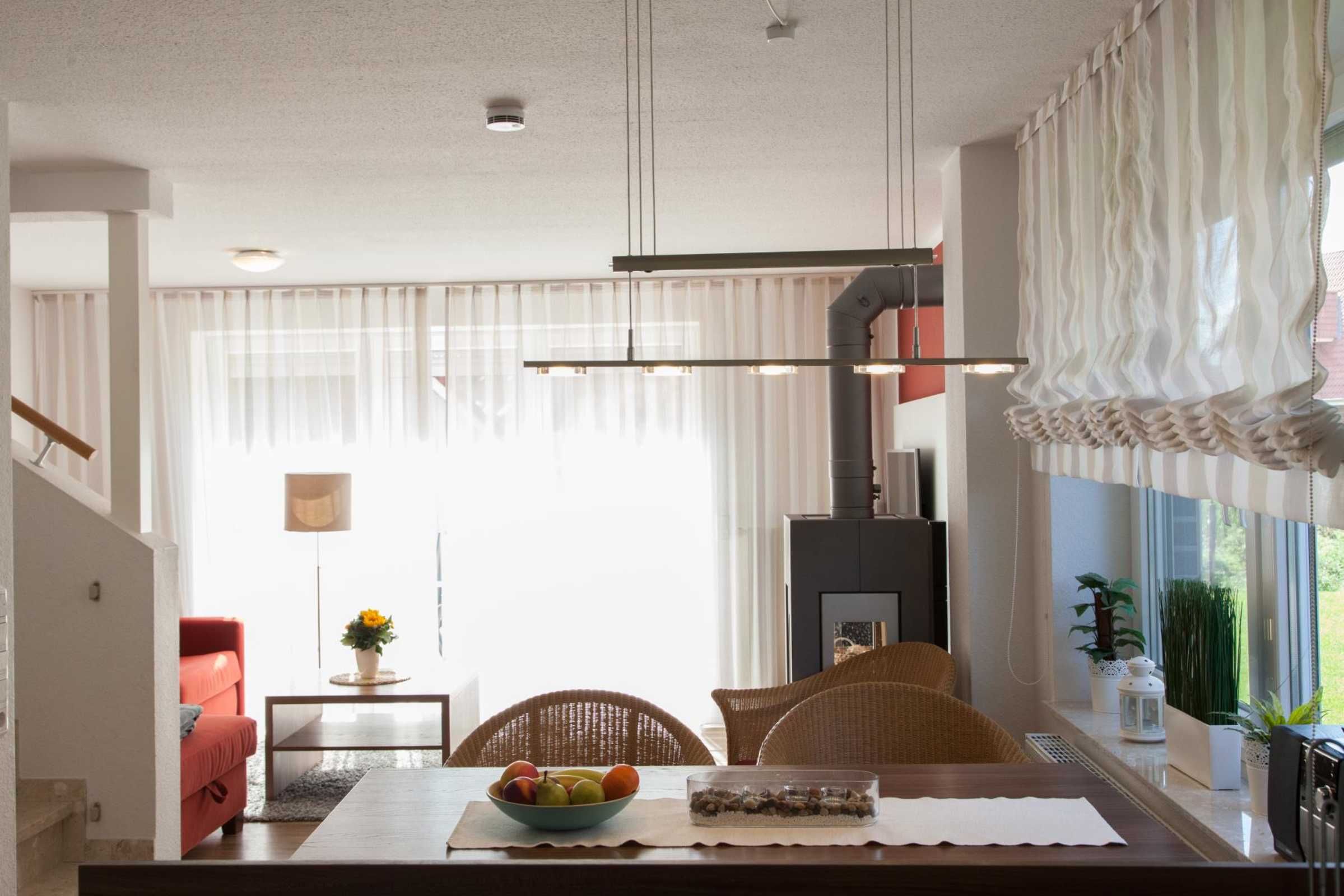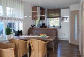 Die offene Küche ist hervorragend ausgestattet mit Backofen, Spülmaschine, Kühlschrank mit Tiefkühlfach, Mikrowelle, Kaffee + Senseo-Maschine, Eier-/Wasserkocher, Toaster, Mixer, Waffeleisen. Geschirr und Gläser sind ausreichend vorhanden. Der Essbereich lädt mit großem Tisch und gemütlichen Stühlen ein.