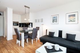 Urlaub von Anfang an ist das Konzept dieser ansprechenden, exklusiven 2-Zimmer-Ferienwohnung in der 2. Etage, ca. 37,5 m² groß, mit sonniger Loggia in Ostausrichtung (mit Balkonmöbeln + Auflagen) mit Blick über die Wiesen bis zum Rantumer Becken, deren Wohnbereich mit einem modernen Designboden in Holzoptik ausgelegt ist.