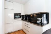 Offene Einbauküche mit Kühl- und Gefrierkombination (3 Extra-Gefrier-Schubladen), Induktionsherd, Backofen mit integrierter Mikrowelle, Geschirrspülmaschine, Waschmaschine, Senseo-Kaffeemaschine, Sodastream-Gerät (Sprudler für Mineralwasser), Glasrückwand, LED-Unterschrankbeleuchtung und Granit-Arbeitsplatte.