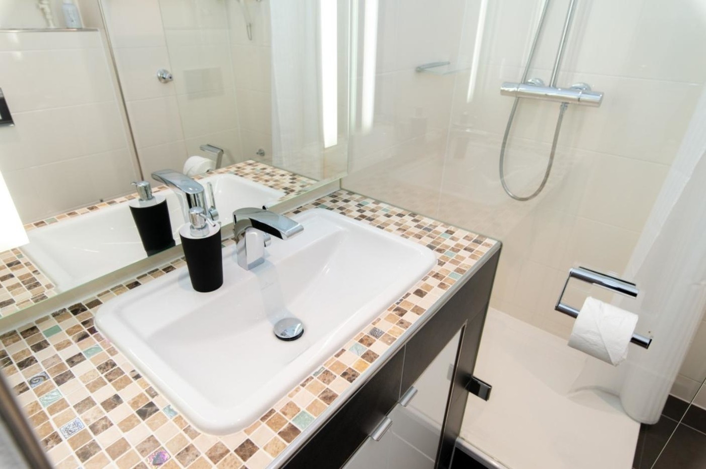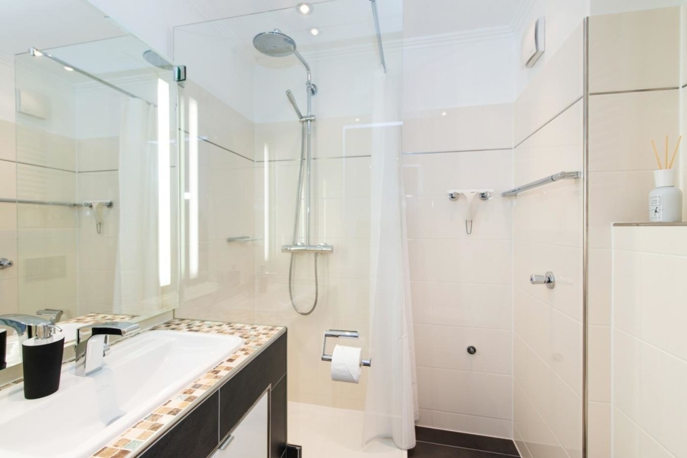 Kompaktes Design-Badezimmer mit Glas-Schiebetür, beleuchtetem Spiegel, Deckenspots, Waschtisch mit Unterbauschrank, Dusche 75 x 100 cm mit extraflachem Einstieg, Handtuchheizkörper und Duravit-WC.
