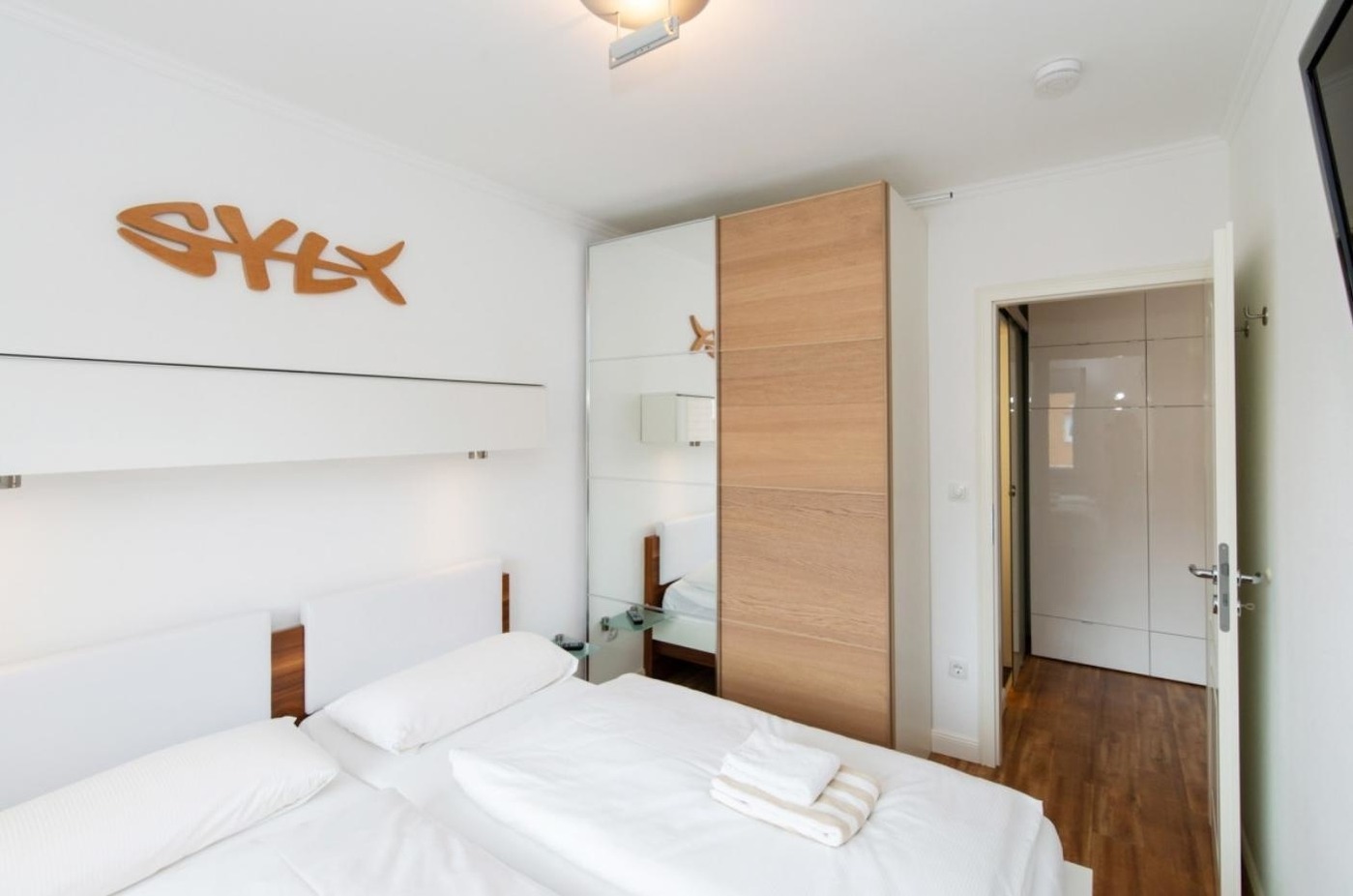 Das Schlafzimmer verfügt über ein Doppelbett (Liegefläche 1,60 x 2,00 m mit 2 Einzelmatratzen), einen an der Wand befestigten Flat-TV (37 Zoll) und einen Kleiderschrank mit Spiegel-Schiebetür.