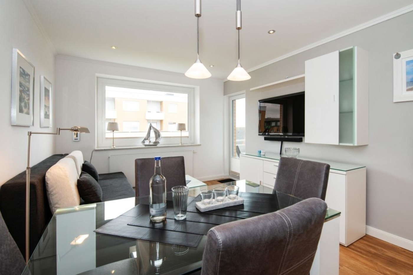 Wohnzimmer mit Schlafcouch (Liegefläche 1,50 x 2 m, mit integriertem Bettkasten), Hocker, Glasesstisch mit 4 Stühlen, großer Flat-TV (46 Zoll, Wandbefestigung) mit Wireless-Audio-Sound-Bar (Bluetooth, Radio), durchgängige Deckenbeleuchtung mit dimmbaren Halogen-Deckenspots und einzelnen LED-Akzenten.