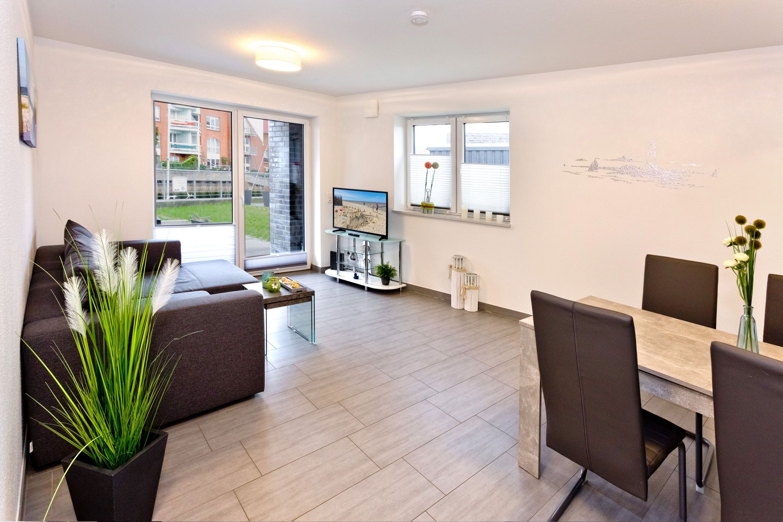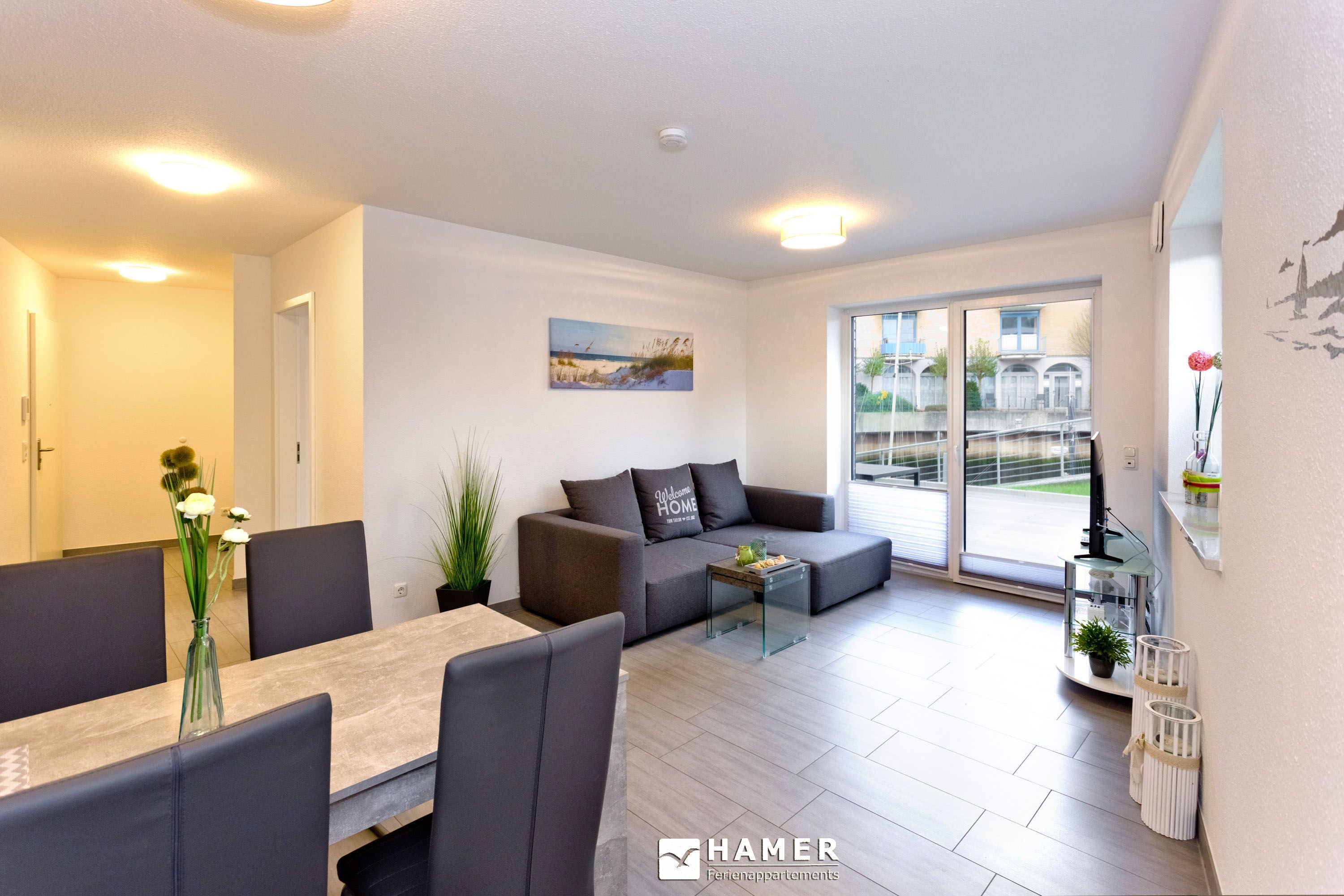 Neue 2-Raum-Wohnung für 2 Pers. in der City Marina im Erdgeschoss mit großer Terrasse (west) direkt am Hafenbecken. Voll ausgestattete Küchenzeile mit Backofen, Geschirrspüler etc.. Wohn- Esszimmer mit Smart-TV, Schlafzimmer mit Doppelbett & elektr.. Rollläden, Badezimmer mit ebenerdige Dusche/WC. Waschmaschine i.d. Wohnung, kostenloses W-Lan, Stellplatz #2 und großer separater Abstellraum mit E-Bike Lademöglichkeit, keine Haustiere und natürlich Nichtraucher.