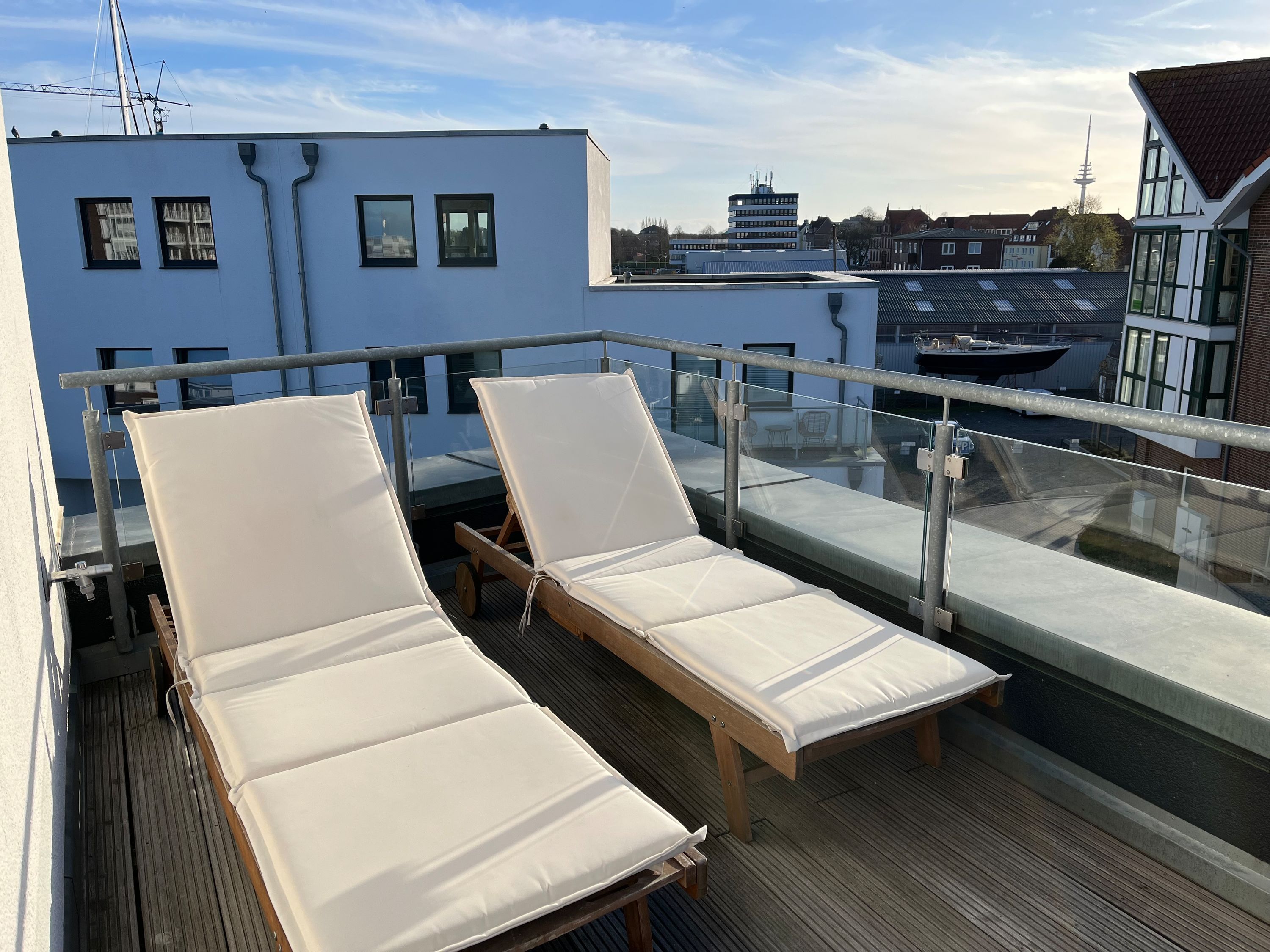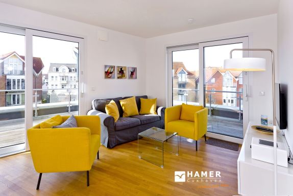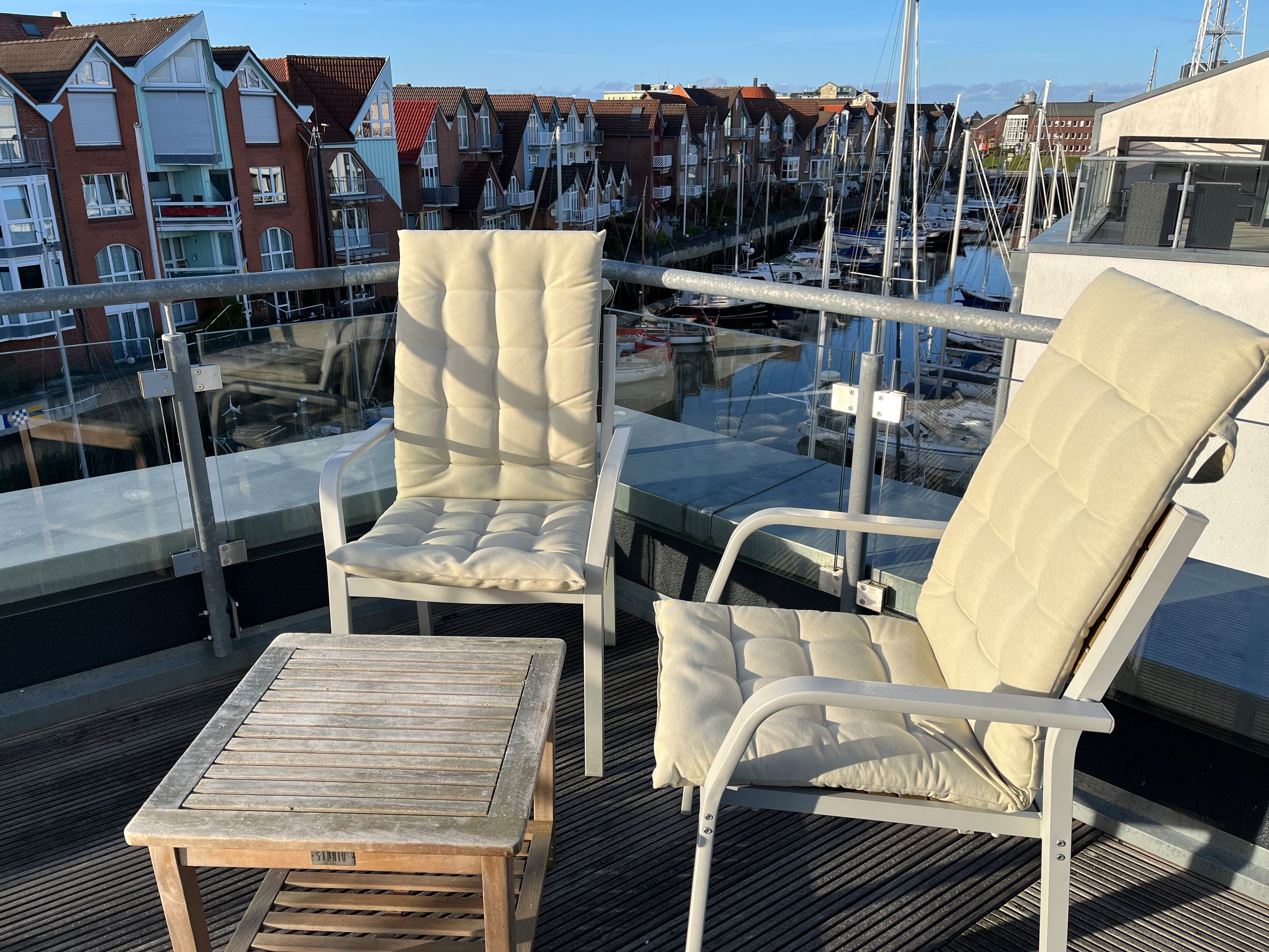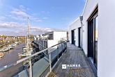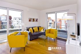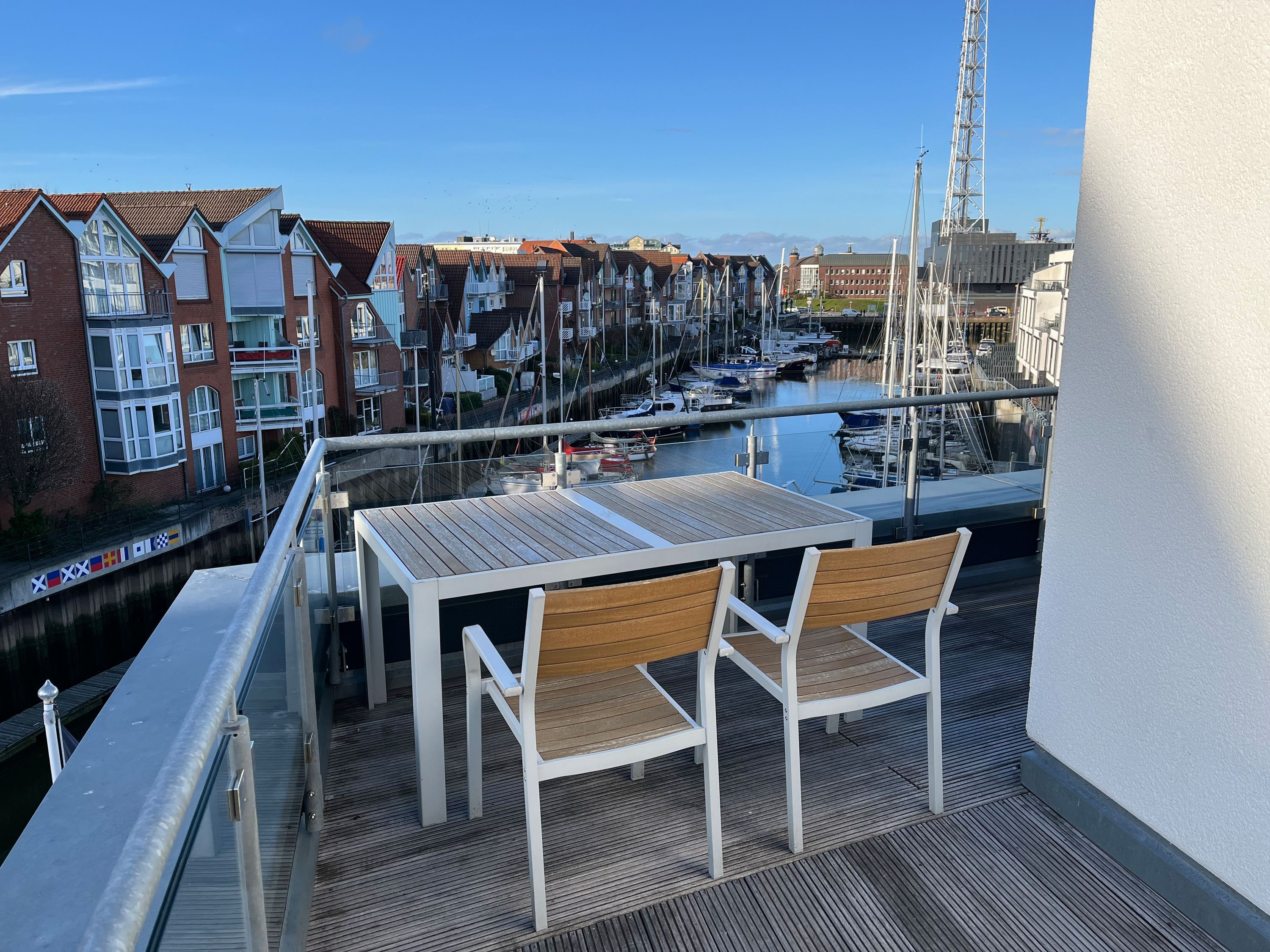 Tolles Penthouse in der City-Marina! 3-Raum-Wohnung für max. 3 Pers. in der 3.Etage mit umlaufenden Balkon (Nord, West, Ost) und durchgehend Sonne. Zugang über Fahrstuhl und vollständig barrierefreie Wohnung. Durch kostenloses WLAN und Schreibtisch Workation geeignet. Vollausgestattete Küchenzeile mit Backofen, Geschirrspüler, Mikrowelle, Senseo, etc.. Wohnzimmer, 3xTV, 1 Schlafzimmer mit Doppelbett, 1 Schlafzimmer mit Einzelbett, 2 Badezimmer mit ebenerdigen Duschen, WC, Föhn, Waschmaschine i.d. Wohnung. Alle Fenster verfügen über elektr. Rollläden, Balkonmöbel (Tisch und Stühle), Liegen und Polster für die Nutzung des umlaufenden Balkons. Stellplatz #7 am Haus, großer separater Abstellraum für Fahrräder mit E-Bike Lademöglichkeit , keine Haustiere und natürlich Nichtraucher