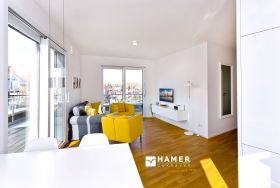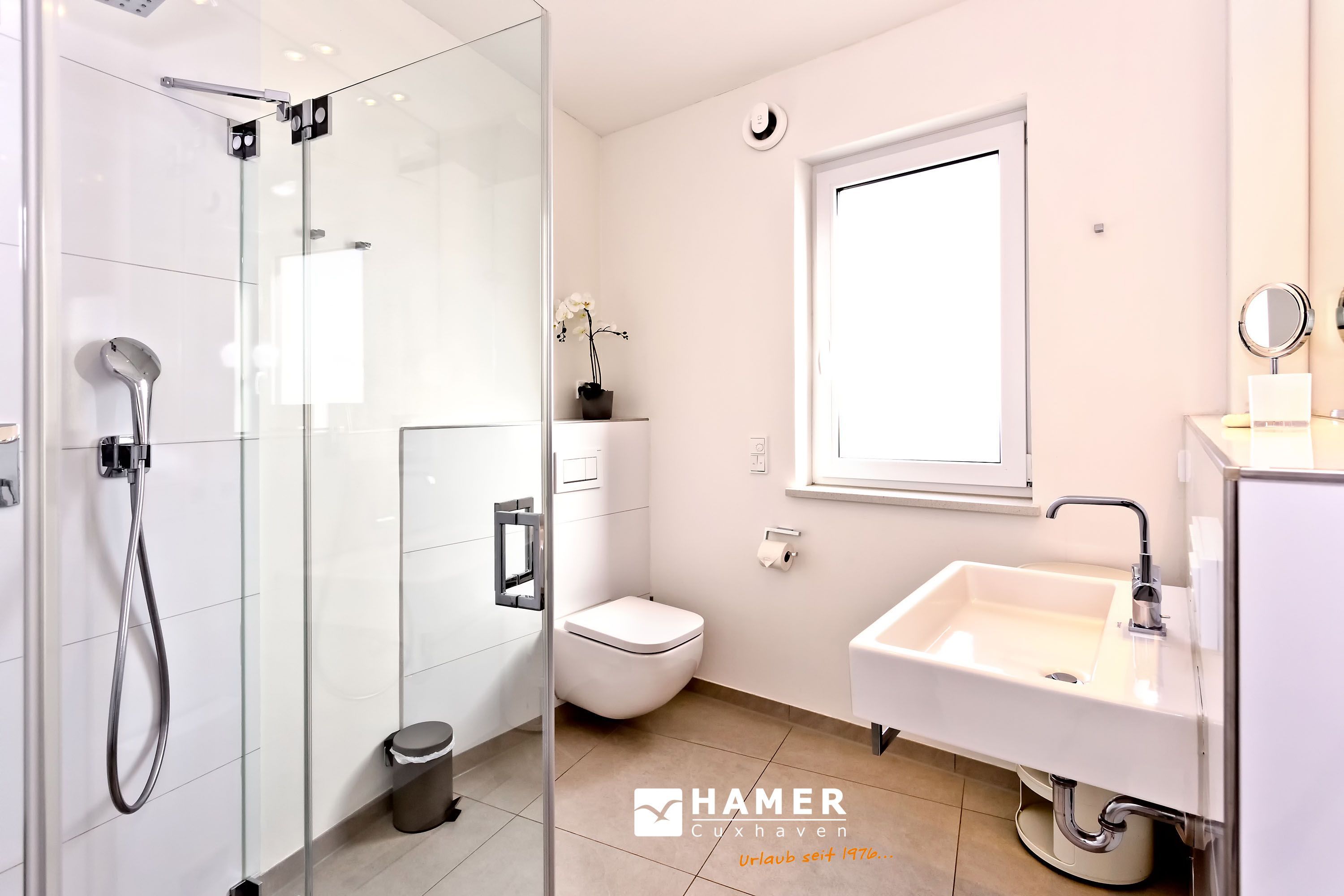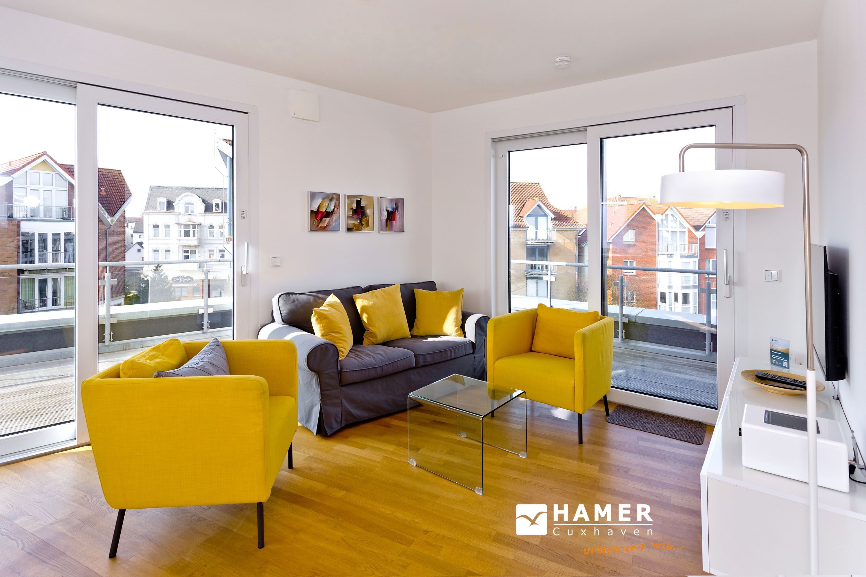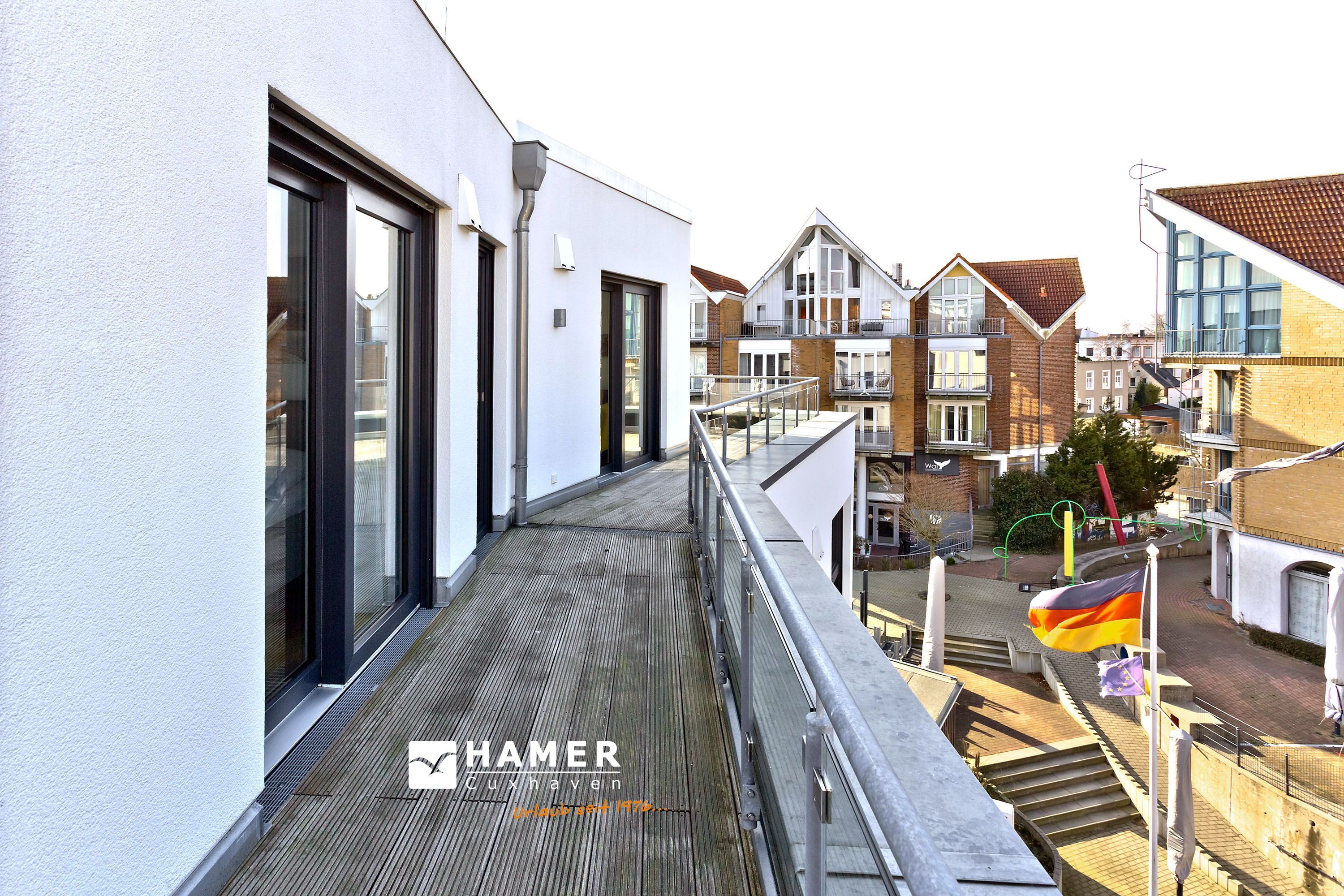 Tolles Penthouse in der City-Marina! 3-Raum-Wohnung für max. 3 Pers. in der 3.Etage mit umlaufenden Balkon (Nord, West, Ost) und durchgehend Sonne. Zugang über Fahrstuhl und vollständig barrierefreie Wohnung. Durch kostenloses WLAN und Schreibtisch Workation geeignet. Vollausgestattete Küchenzeile mit Backofen, Geschirrspüler, Mikrowelle, Senseo, etc.. Wohnzimmer, 3xTV, 1 Schlafzimmer mit Doppelbett, 1 Schlafzimmer mit Einzelbett, 2 Badezimmer mit ebenerdigen Duschen, WC, Föhn, Waschmaschine i.d. Wohnung. Alle Fenster verfügen über elektr. Rollläden, Balkonmöbel (Tisch und Stühle), Liegen und Polster für die Nutzung des umlaufenden Balkons. Stellplatz #7 am Haus, großer separater Abstellraum für Fahrräder mit E-Bike Lademöglichkeit , keine Haustiere und natürlich Nichtraucher