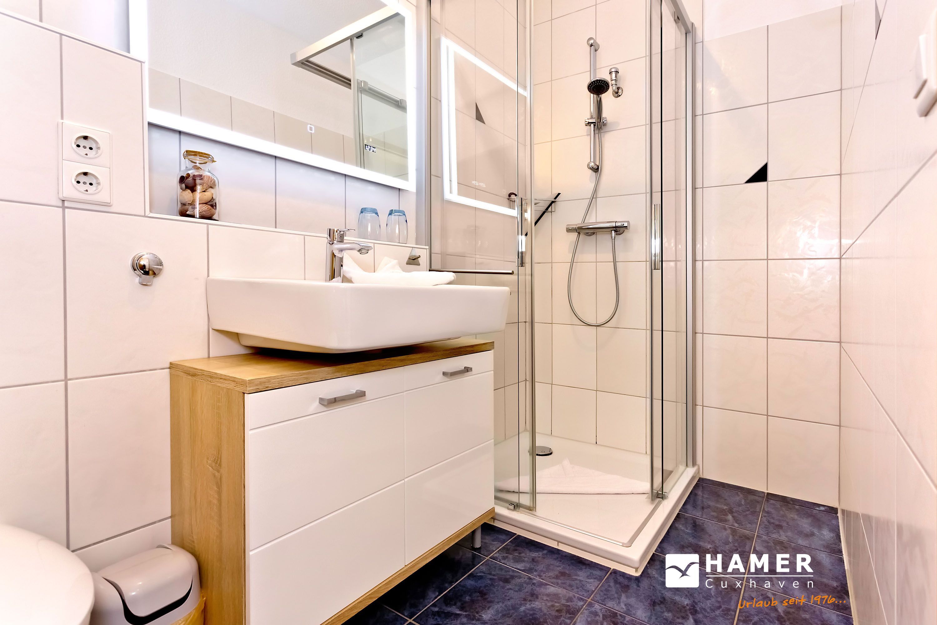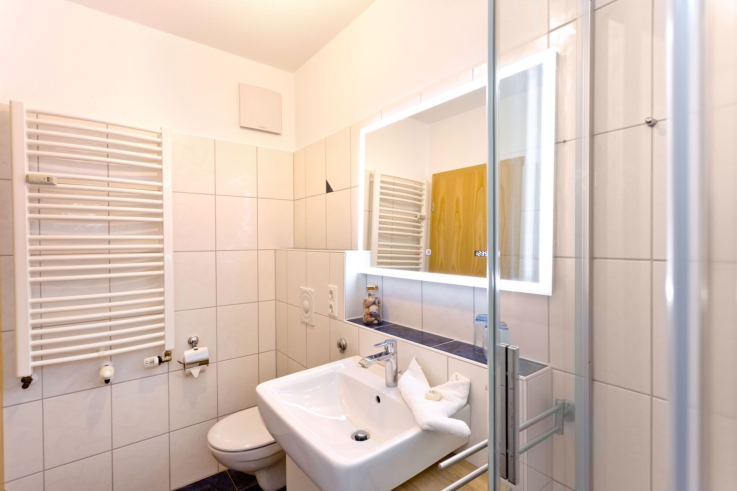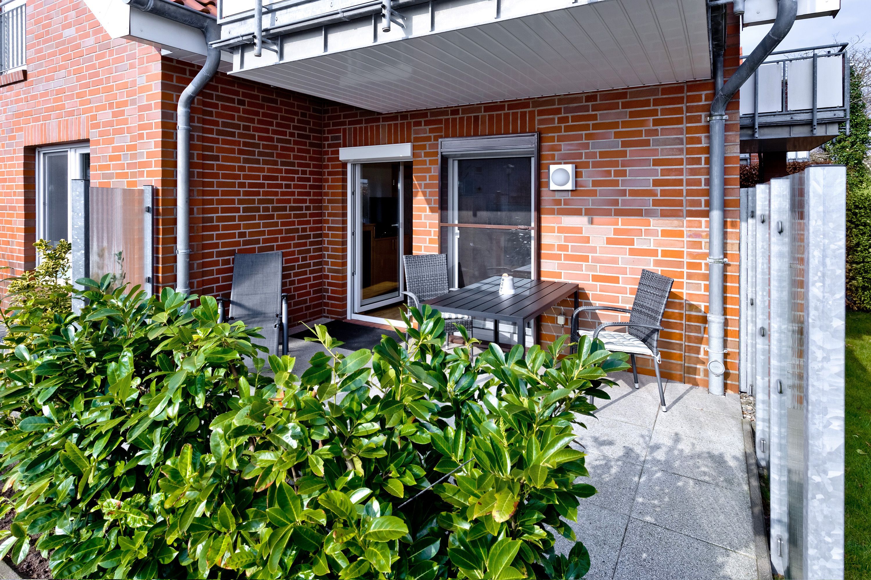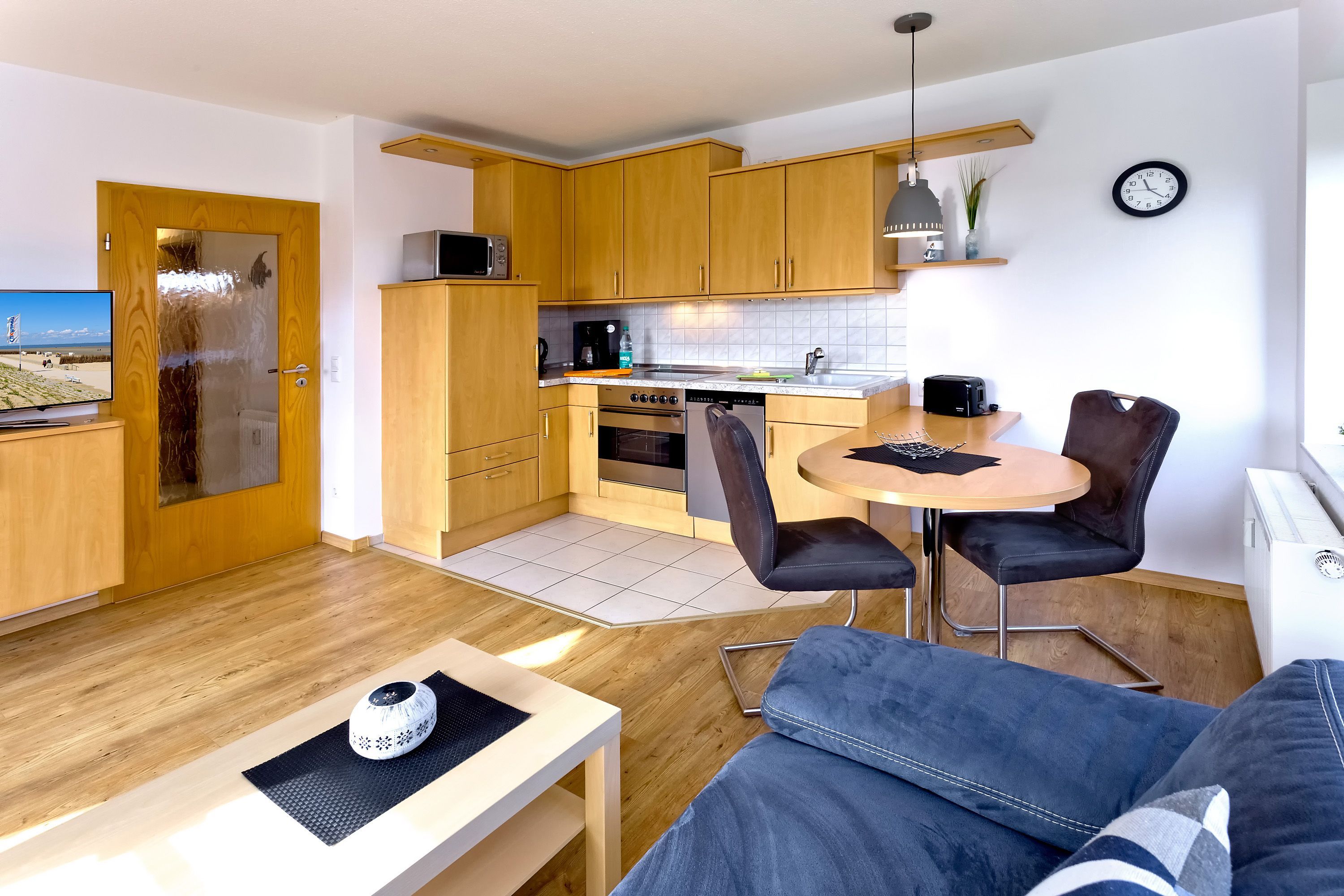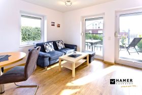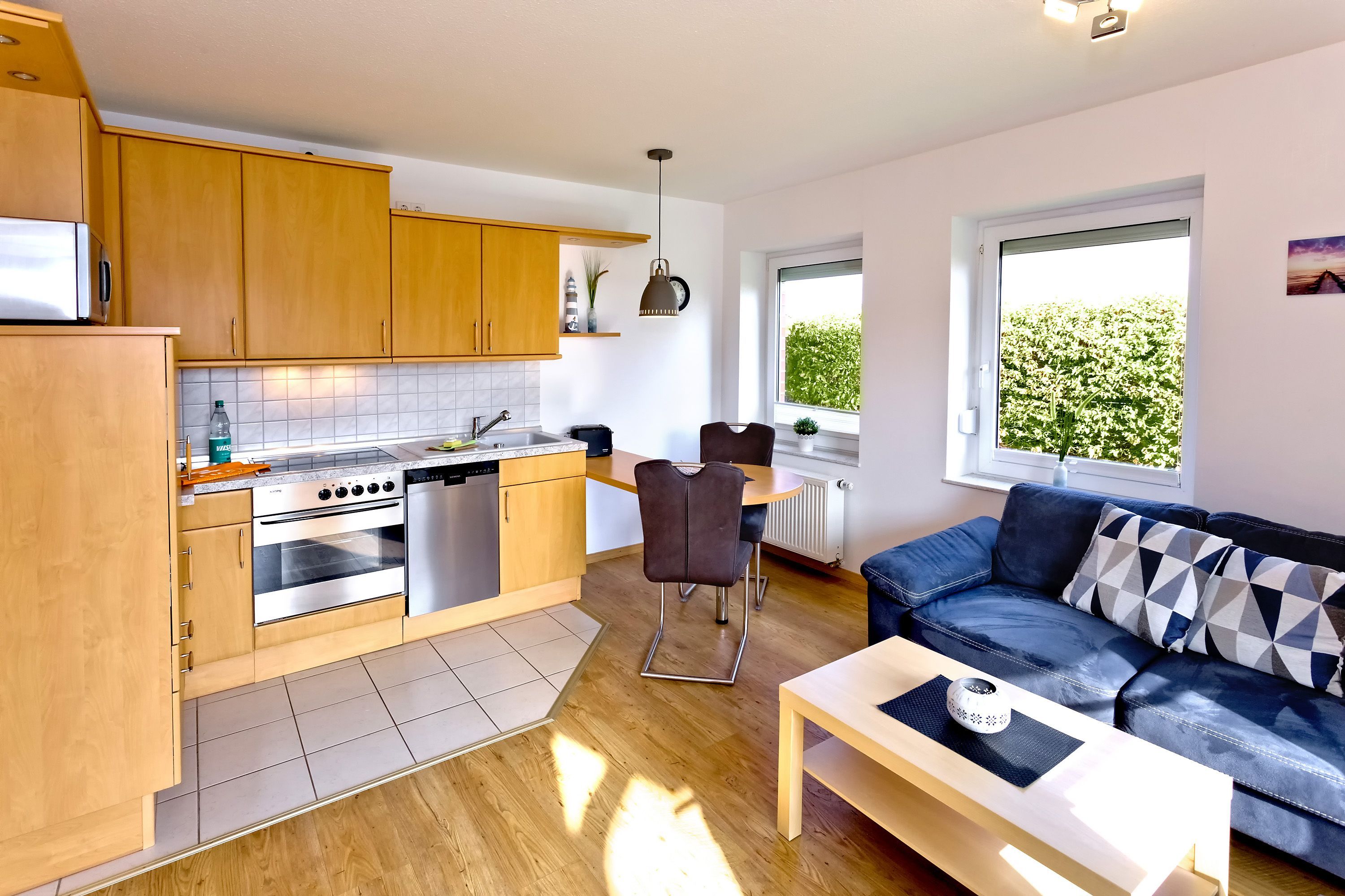 Gemütliche 2-Raum-Wohnung in ruhiger Wohnanlage. Auf 38m² komplett ausgestattet für 2 Personen. Wohnzimmer mit integrierter Küchenzeile (Backofen, Mikrowelle, Ceranfeld etc.), TV, W-Lan kostenfrei, Stereoanlage und Zugang zur überdachten Südterrasse. Schlafzimmer mit Doppelbett & TV, Dusche/WC. Alle Fenster sind mit Außenrollläden versehen. reservierter PKW-Stellplatz #7 am Haus, natürlich Nichtraucher und keine Haustiere.