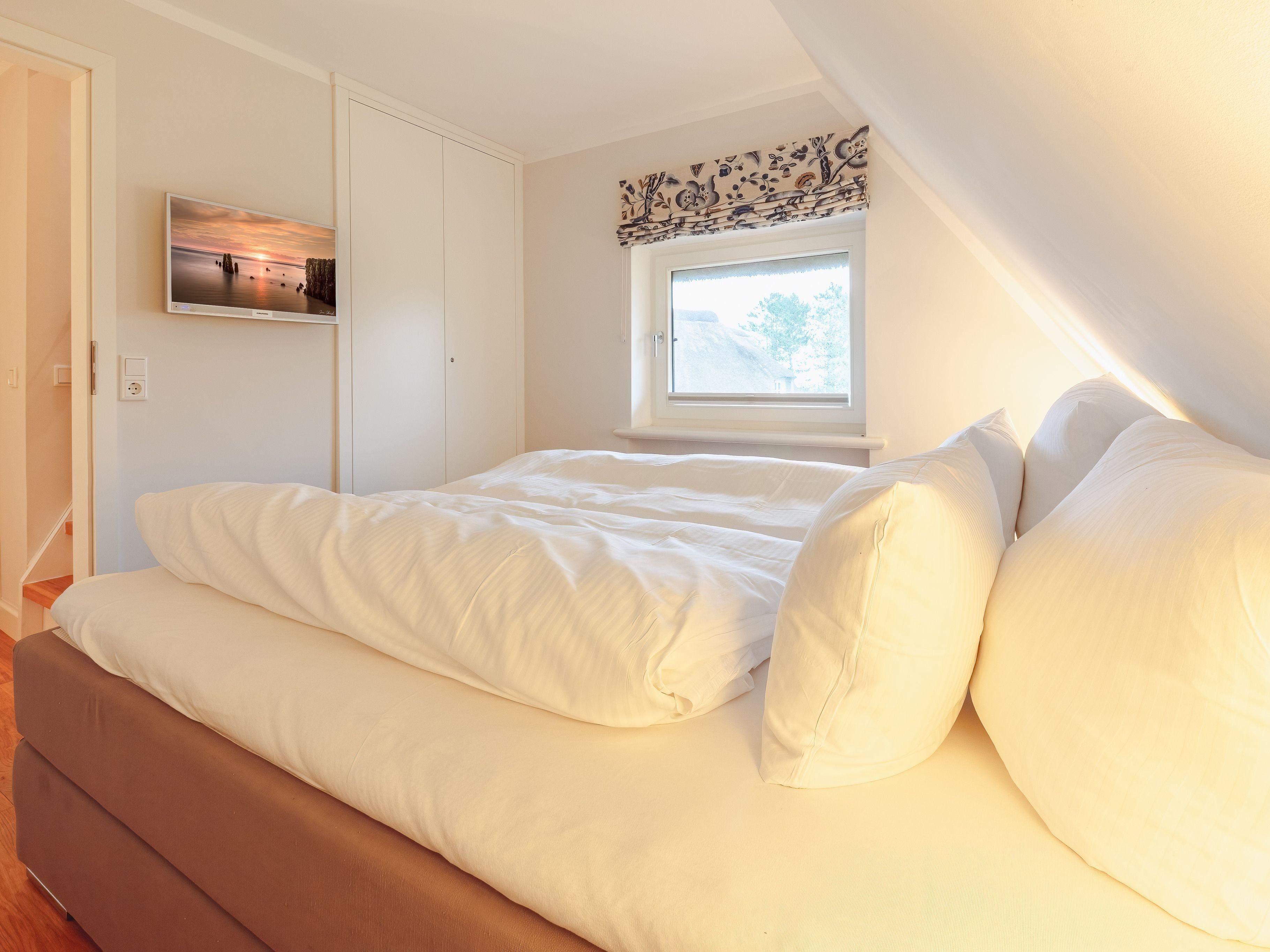 In ruhiger Lage oberhalb des Wattenmeeres und mit herrlichem Weitblick auf die Kampener Dünen liegt das Haus Altué, eingebettet in einen schönen Heidegarten. Dieses Hausteil ist hell, freundlich und mit stilvollen kleinen Details eingerichtet. Sie treten direkt in den modernen Wohnbereich mit Essbereich, komplett ausgestatteter Küchenzeile und Sofaecke an der großen Fensterfront ein, gefolgt vom Zugang zur Terrasse gen Osten mit Strandkorb. Im Obergeschoss finden Sie ein modernes Duschbad, sowie ein behagliches Doppelschlafzimmer unter der Schräge. Ein weiteres großzügiges Doppelschlafzimmer mit Sofaecke für gemütliche Lesestunden und ein Duschbad en suite liegen im abgeschlossenen Untergeschoss. Das gesamte Hausteil ist mit Echtholzfußboden ausgestattet.