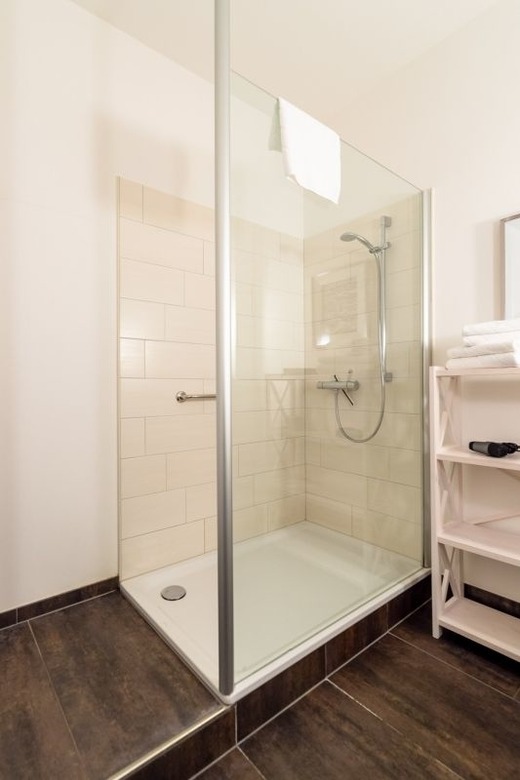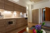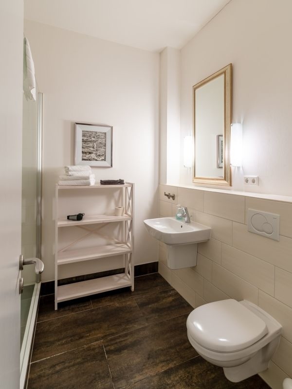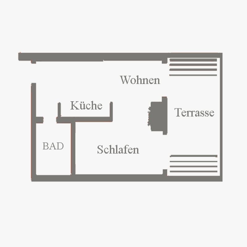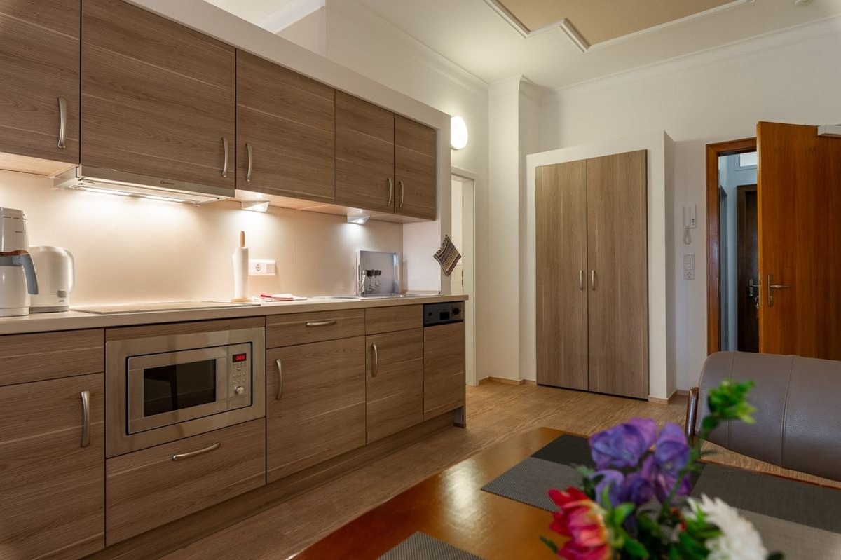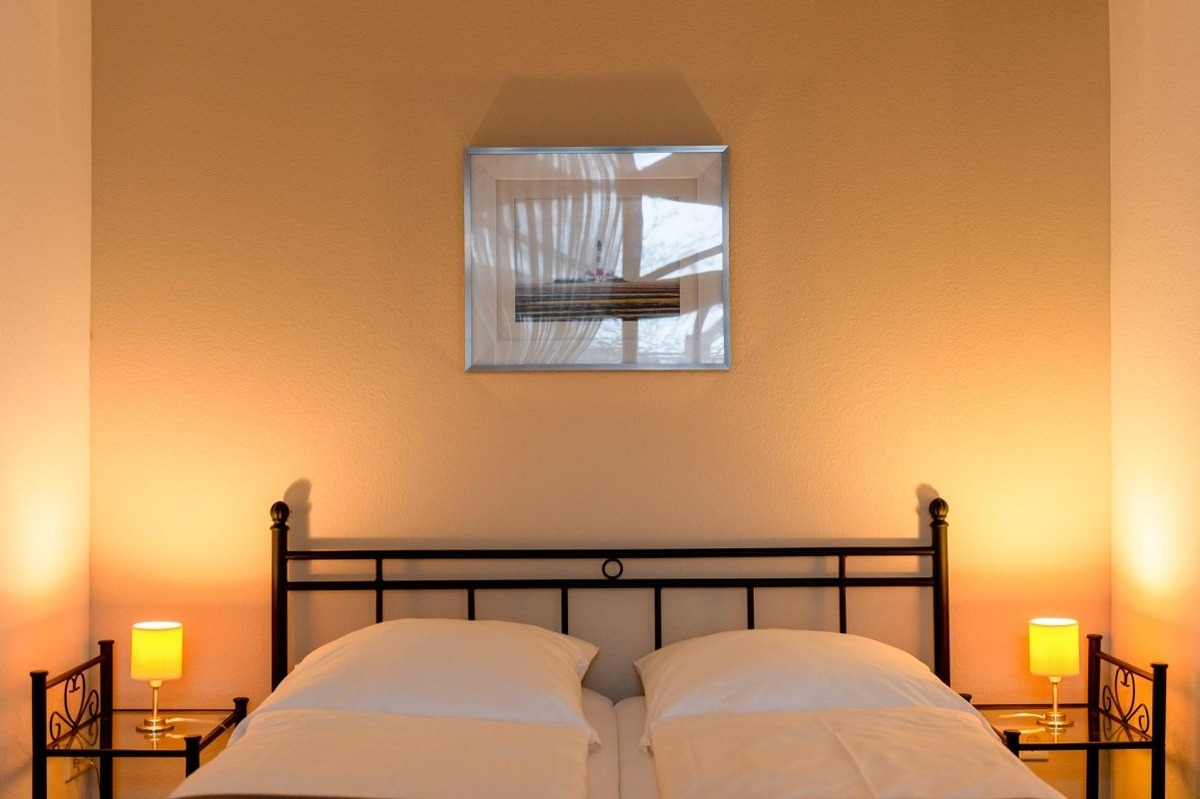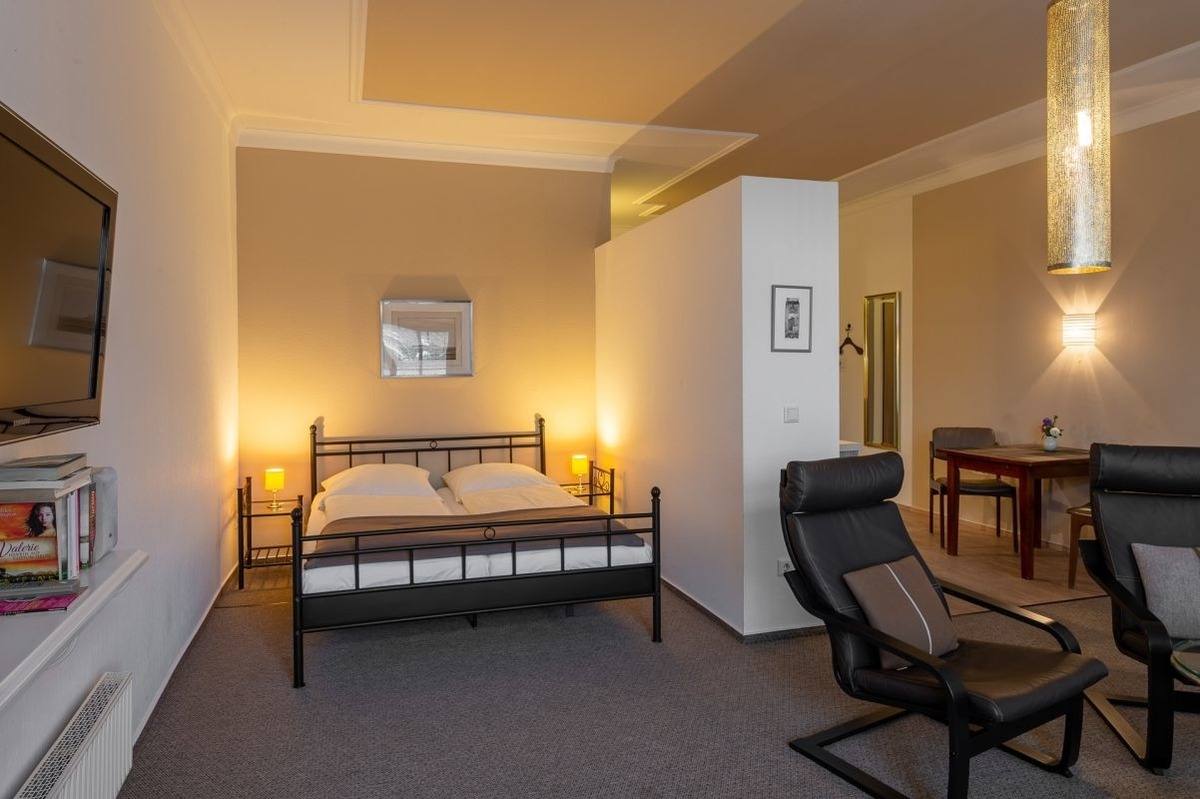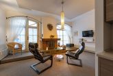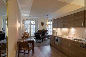 Die modern eingerichtete Ferienwohnung liegt im 1. Obergeschoß des Stadthauses. Die ca. 30 m² große 1-Raum Ferienwohnung besteht aus einem kombinierten Wohn- und Schlafraum, einer Küchenzeile, einem Badezimmer und einer großen Sonnenterrasse. Der kombinierte Wohn-/Schlafraum ist eingerichtet mit 2 Sesseln vor dem Kamin, einer Stereo-Anlage, einem TV-Gerät (Flachbildschirm) sowie einem Doppelbett (1,60 m x 2,00 m). Die offene Küchenzeile ist mit einem Ceran-Kochfeld, einem Kühlschrank mit Gefrierfach, einem Wasserkocher, einem Toaster und einer Kaffeemaschine und einer Mikrowelle/Backofen eingerichtet. Direkt gegenüber der Küchenzeile ist ein Essplatz für 2 Personen. Das Badezimmer ist mit einer ebenerdigen Dusche und einem WC ausgestattet. Die große Sonnenterrasse mit Gartenmöbeln lädt zum Erholen und Entspannen ein.Weitere Angaben: Bettwäsche, Handtücher und Endreinigung im Preis inklusive. Dies ist eine Nichtraucher-Wohnung!