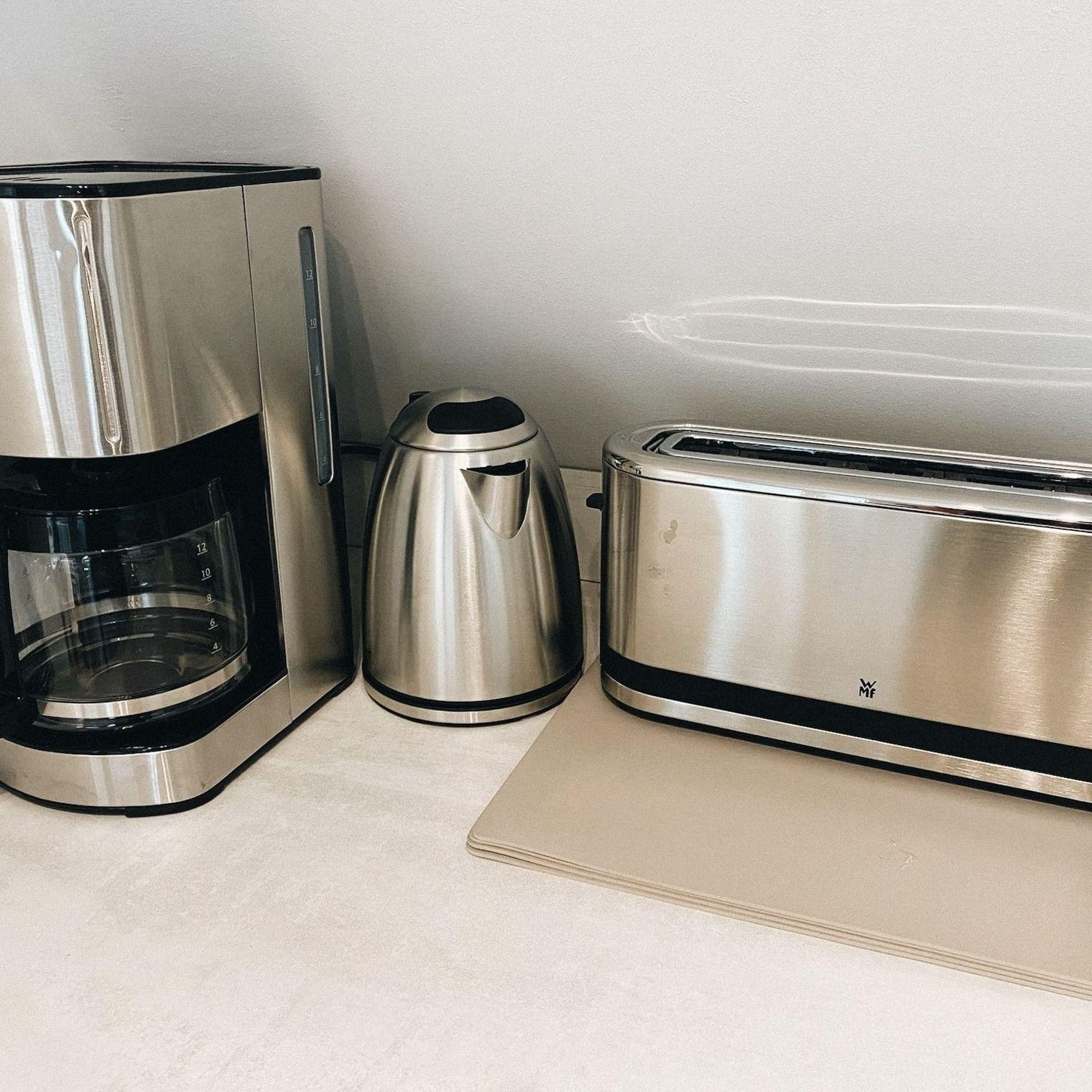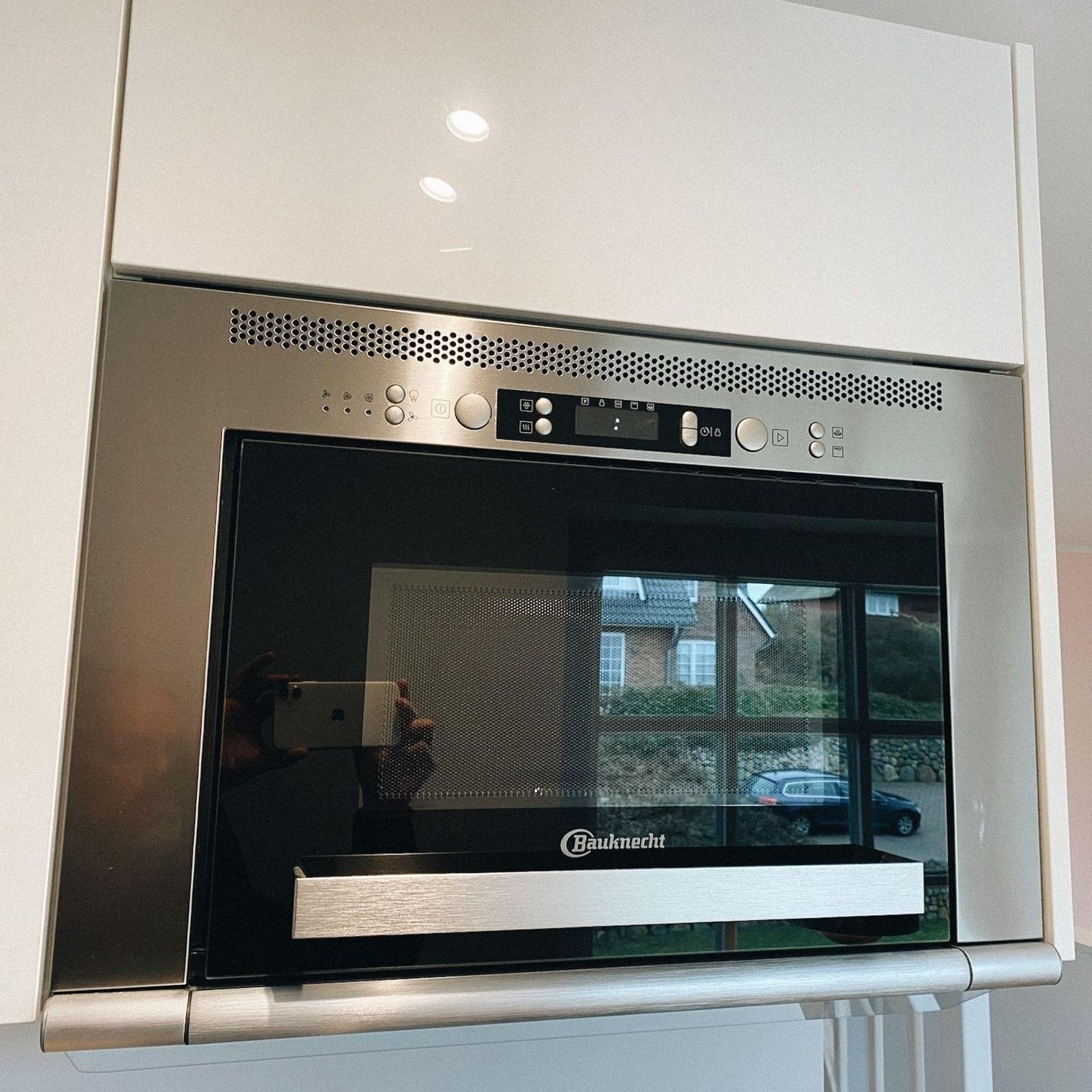 Neue Einbauküche von Sylter Küchen: Weiße Einbauküche mit Geschirrspülmaschine, integrierter Mikrowelle, Kühlschrank mit extra Getränkefach und Tiefkühler, 1 Wasserkocher, 1 Toaster, 1 Kaffeemaschine, Kochutensilien und Gedecke für 6 Personen