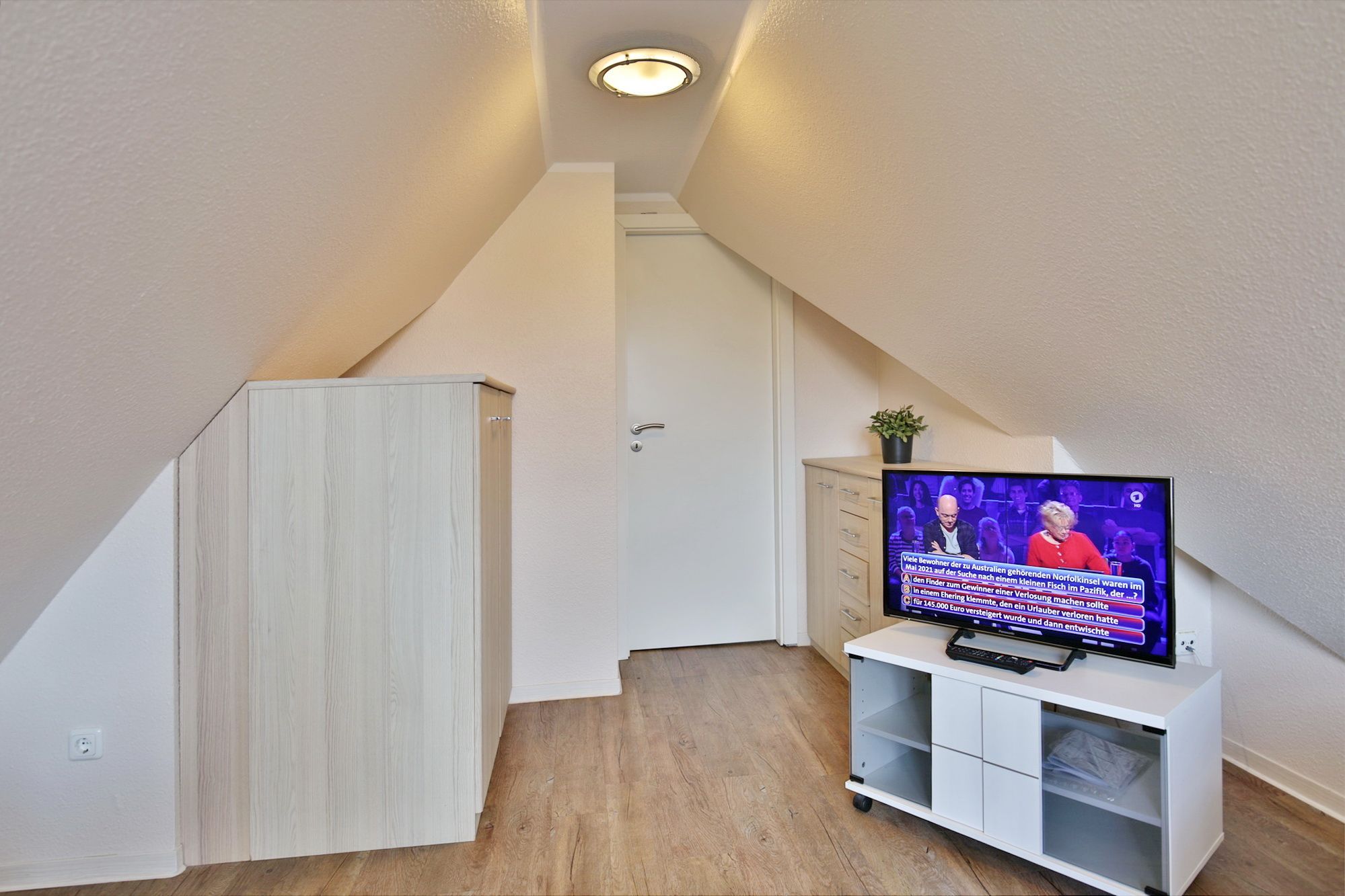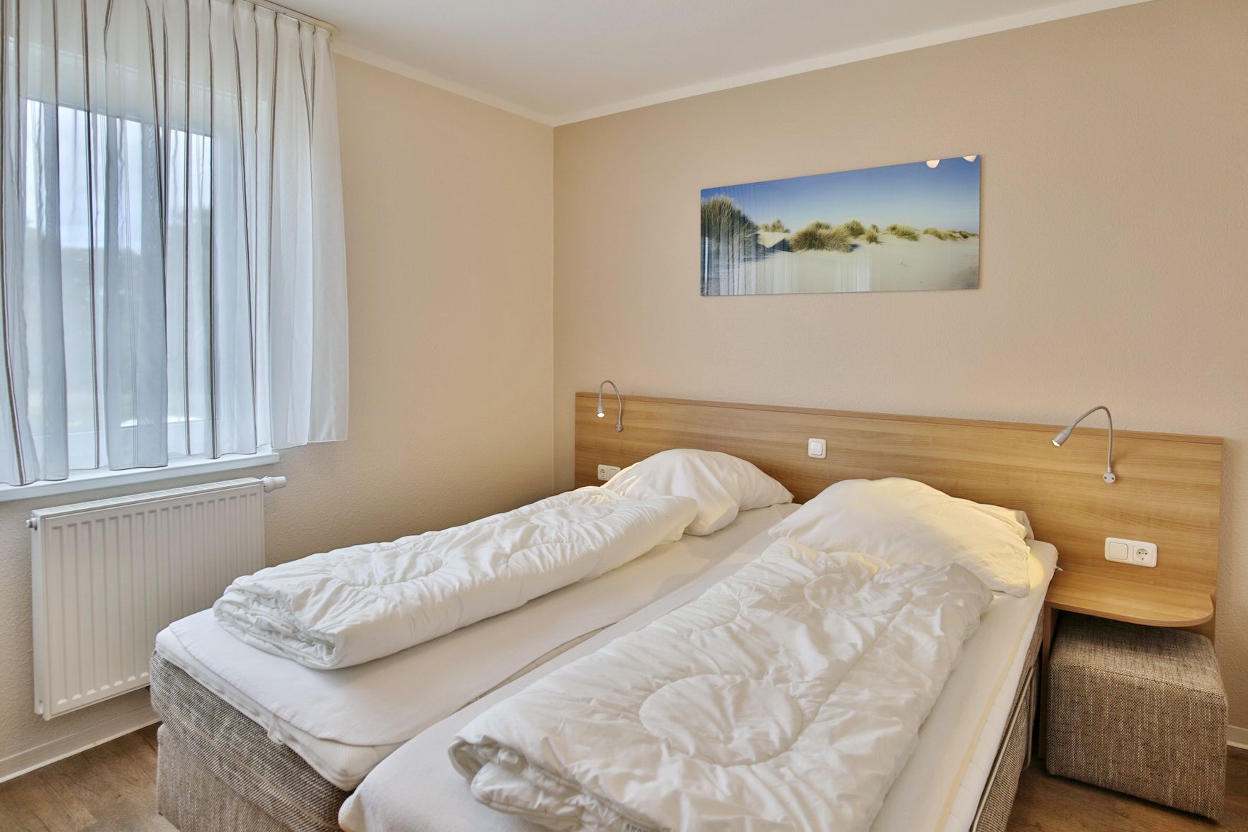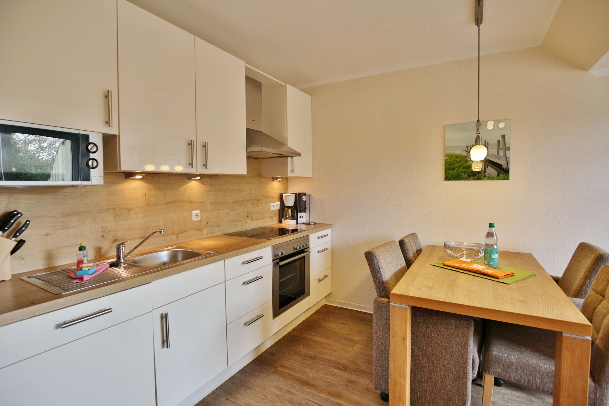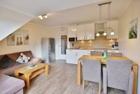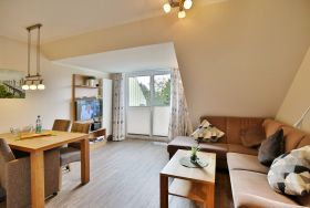 Sehr schöne 3-Raum-Maisonette-Wohnung auf ca. 63m² in der 1.Etage, 1 Schlafzimmer mit Doppelbett und TV, 1 Schlafzimmer im Dachgeschoss mit zwei Einzelbetten u. TV, 2x Du/Wc mit Föhn, Sauna in der Whg. geg.Geb. (Münzer), Wohnzimmer mit großer Küchenzeile (Back., Mikrow., Geschirrspüler) mit SAT-TV, Blue-Ray-DVD, Stereo, kostenloses W-Lan-Internet, großer Balkon (süd) mit Sonnenschirm, Rollläden am Schlafzimmer, Insektenschutz in beiden Schlafzimmern und im Wohnzi., reservierter Pkw-Stellplatz #7 am Haus, keine Haustiere erlaubt und natürlich Nichtraucher.