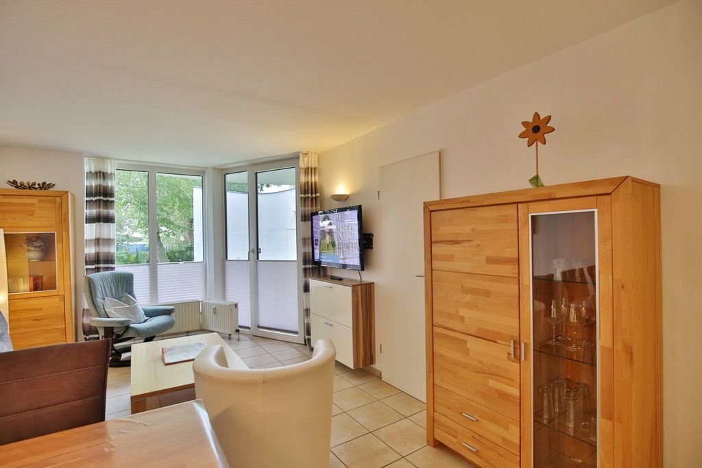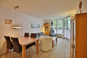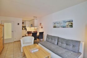 2-Raum-Wohnung auf ca. 40m², parterre, komplett ausgestattet bis 4 Pers., 1 Schlafzimmer mit 2 Einzelbetten (1,90m), 1 kombiniertes Wohn/Schlafzimmer mit Doppelbettcouch, gefliest, Sat-TV, kostenloses W-Lan, Küchenzeile mit Geschirrspüler, Mikrowelle, Backofen und 2 Platten Kochfeld, Badewanne/WC, Flur, Nichtraucher, Terrasse (west), Tiefgarage. Keine Haustiere.