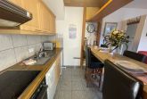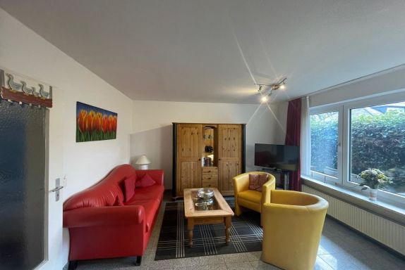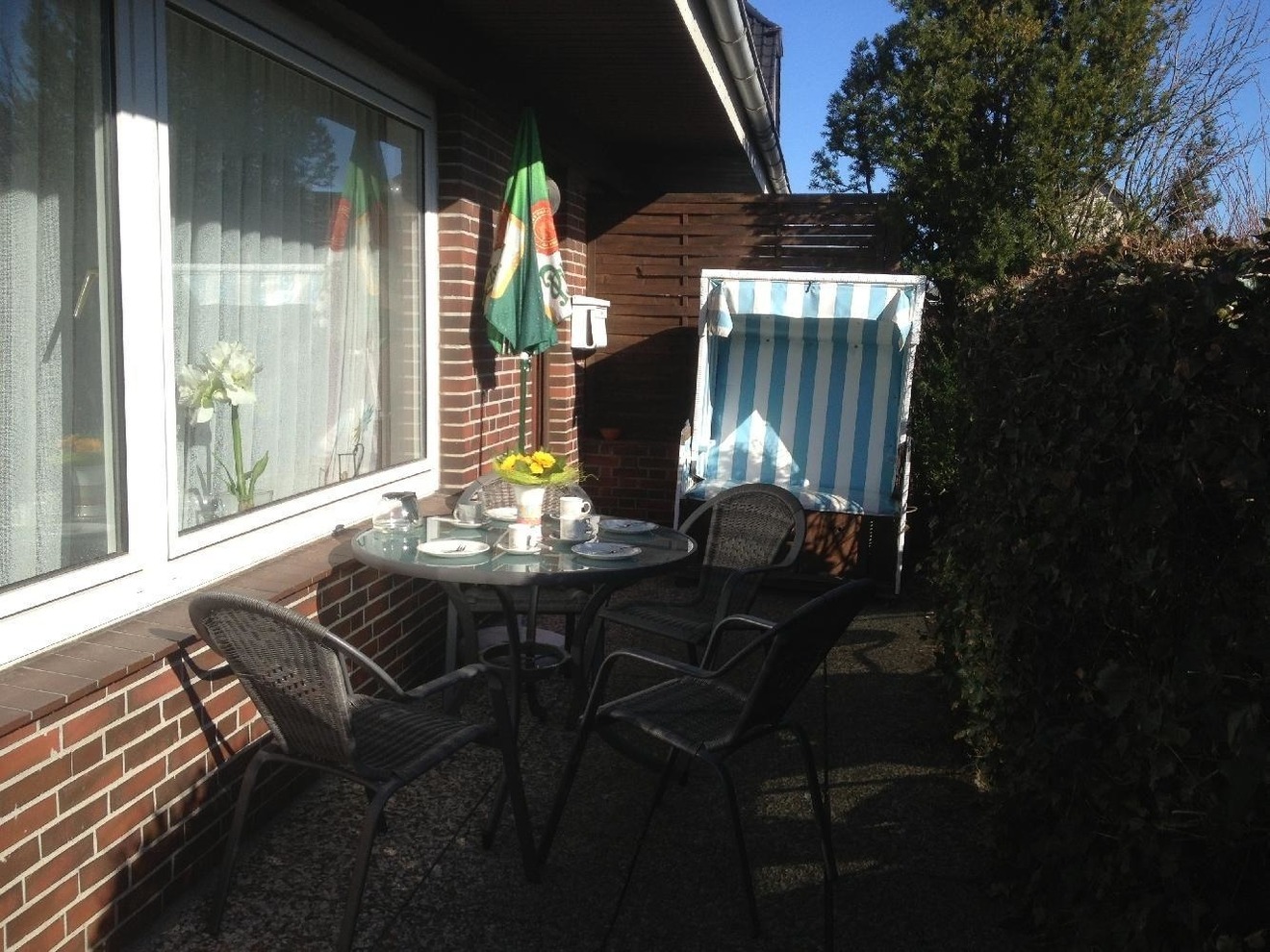 Diese Wohnung im Erdgeschoß hat 2 Zimmer und bietet Platz für 2-4 Personen. Im Wohnraum befindet sich eine zusätzliche Schlafcotusch . Die gute Seeluft können Sie auf einer kleinen Terrasse geniessen. Die Küchenzeile ist zweckmäßig ausgestattet, mit Geschirrspüler, Microwelle, Eier + Wasserkocher. Kaffeemaschine etc.