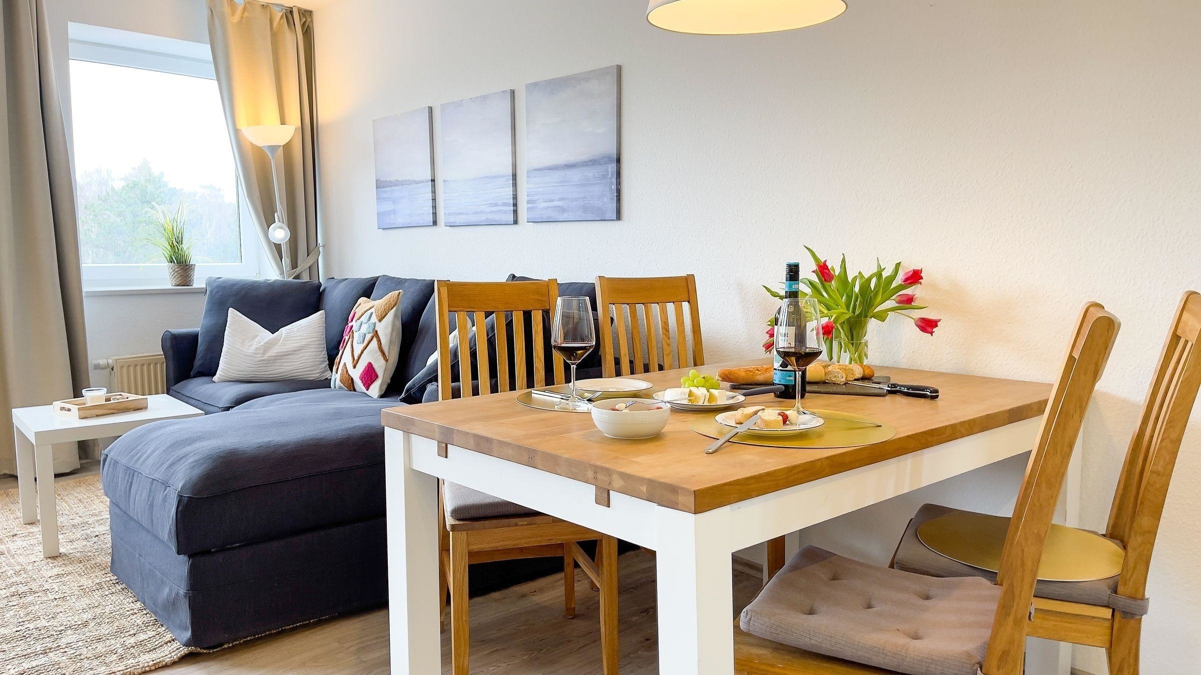 Die Ferienwohnung überzeugt durch ihre moderne Ausstattung und bietet ein allergikerfreundliches Ambiente. Ein großzügiges Schlafzimmer mit einem komfortablen Doppelbett und ein einladendes Wohnschlafzimmer mit einer Schlafcouch sorgen für erholsame Nächte. Die offene Küche ist mit einem Elektro-/Gasherd, Backofen, Mikrowelle, Kühlschrank und Geschirrspüler ausgestattet und lädt zu kulinarischen Entfaltungen ein. Eine Kaffeemaschine, ein Wasserkocher und Toaster stehen bereit, um den Start in den Tag zu erleichtern. Das stilvolle Badezimmer verfügt sowohl über eine Dusche als auch eine Badewanne, ideal für entspannte Momente. Unterhaltung bietet die HiFi-Anlage und ein TV. Praktische Annehmlichkeiten wie WLAN, Waschmaschine, Wäschetrockner und ein Fahrstuhl runden das Angebot ab. Spiele für gesellige Abende sind ebenfalls vorhanden. Die Ferienwohnung ist die perfekte Wahl für einen Aufenthalt voller Komfort und Bequemlichkeit.