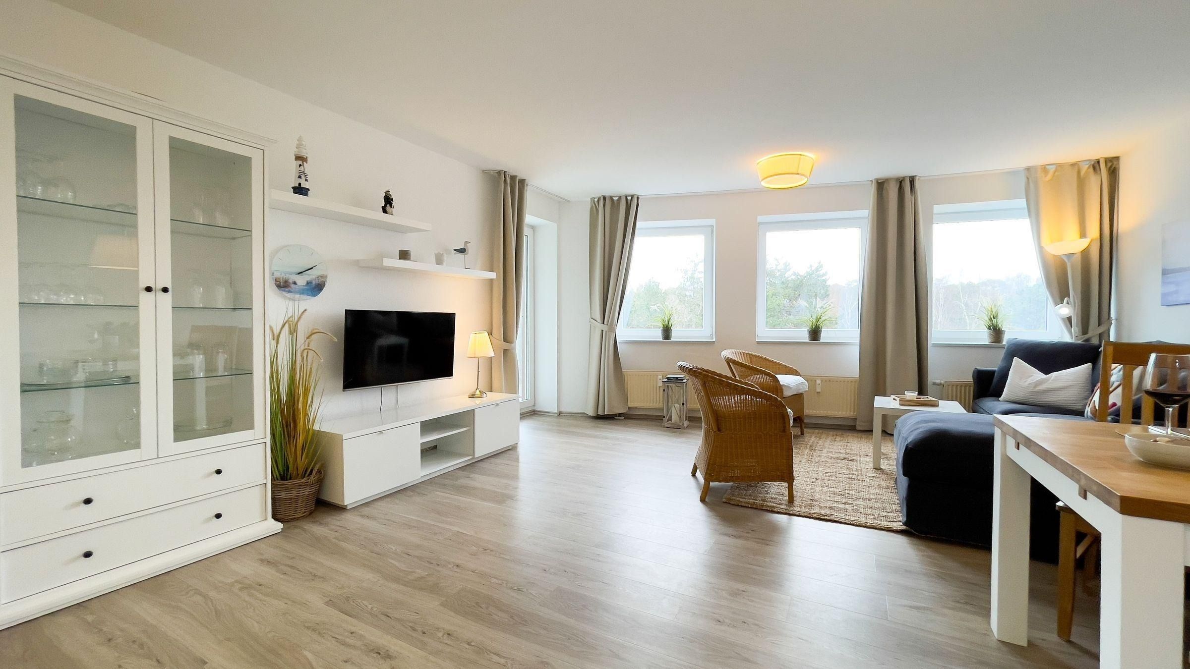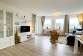 Die Ferienwohnung bietet eine optimale Ausstattung für erholsame Tage. Sie verfügt über ein Schlafzimmer mit einem gemütlichen Doppelbett sowie einem Wohnschlafzimmer, das mit einer Schlafcouch ausgestattet ist. Die offene Küche lässt keine Wünsche offen und ist mit einem Elektro-/Gasherd, Backofen, Mikrowelle, Geschirrspüler und Kühlschrank versehen. Ein Essbereich mit Esstisch lädt zu geselligen Mahlzeiten ein. Das Badezimmer überzeugt mit einer Duschbadewanne und einem Haartrockner. Zur Unterhaltung stehen ein TV und eine HiFi-Anlage bereit. Internet mit WLAN ist ebenfalls verfügbar. Für zusätzlichen Komfort sorgen Waschmaschine, Wäschetrockner und Staubsauger. Die Wohnung ist allergikergeeignet und bietet eine Wohlfühlatmosphäre mit Sofas, Sesseln und gemütlichen Spielmöglichkeiten. Ein Fahrstuhl ermöglicht einen bequemen Zugang. Ideal für einen unbeschwerten Aufenthalt in angenehmer Umgebung.