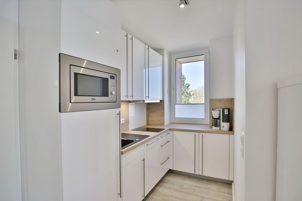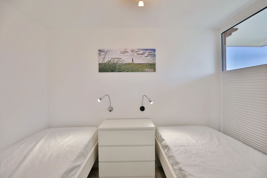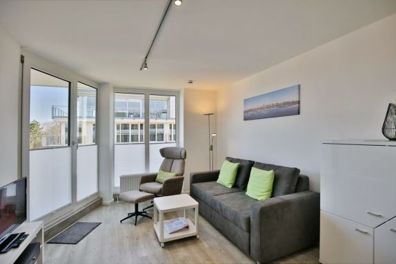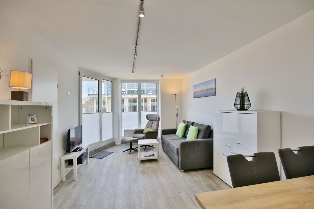 2-Raum-Eckwohnung auf ca. 42m², Nichtraucher, 3. Etage, komplett ausgestattet für 2 Pers., 1 Schlafzimmer mit 2 Einzelbetten (1,90m), 1 kombiniertes Wohn/Schlafzimmer mit Doppelbetteckcouch, Sat-TV, kostenloses W-Lan, neue Küchenzeile mit Gefrierf. u. Mikrowelle, Dusche/WC, Flur, Balkon (ost) mit Seesicht, keine Haustiere, Tiefgaragenstellplatz #301.