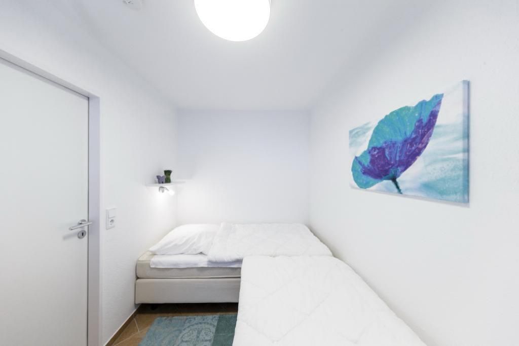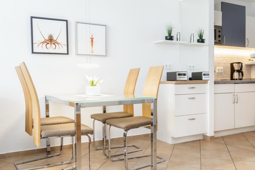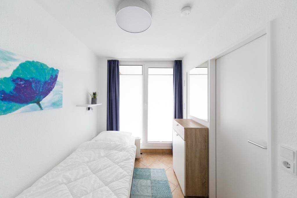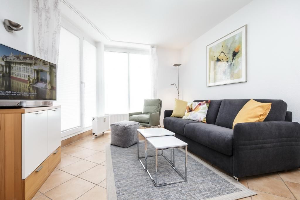 2-Raum-Wohnung auf ca. 40m², 3. Etage, sehr schön renoviert und komplett ausgestattet bis 3 Pers., 1 Schlafzimmer mit 2 Einzelbetten (2,00 m), 1 kombiniertes Wohn/Schlafzimmer mit Eckschlafcouch, Sat-TV, kostenloses W-Lan, gute Einbauküche mit Mikrowelle u. Geschirrspüler , Dusche/WC, Fön, Flur, komplett gefliest, Balkon (ost) mit Teilseesicht, keine Haustiere, Nichtraucher, Tiefgarage #305.