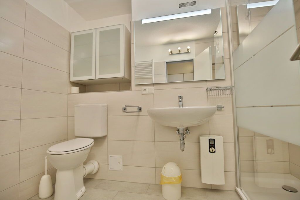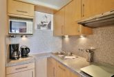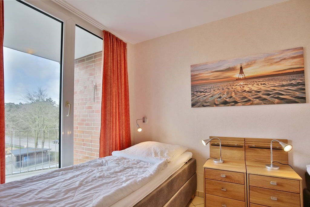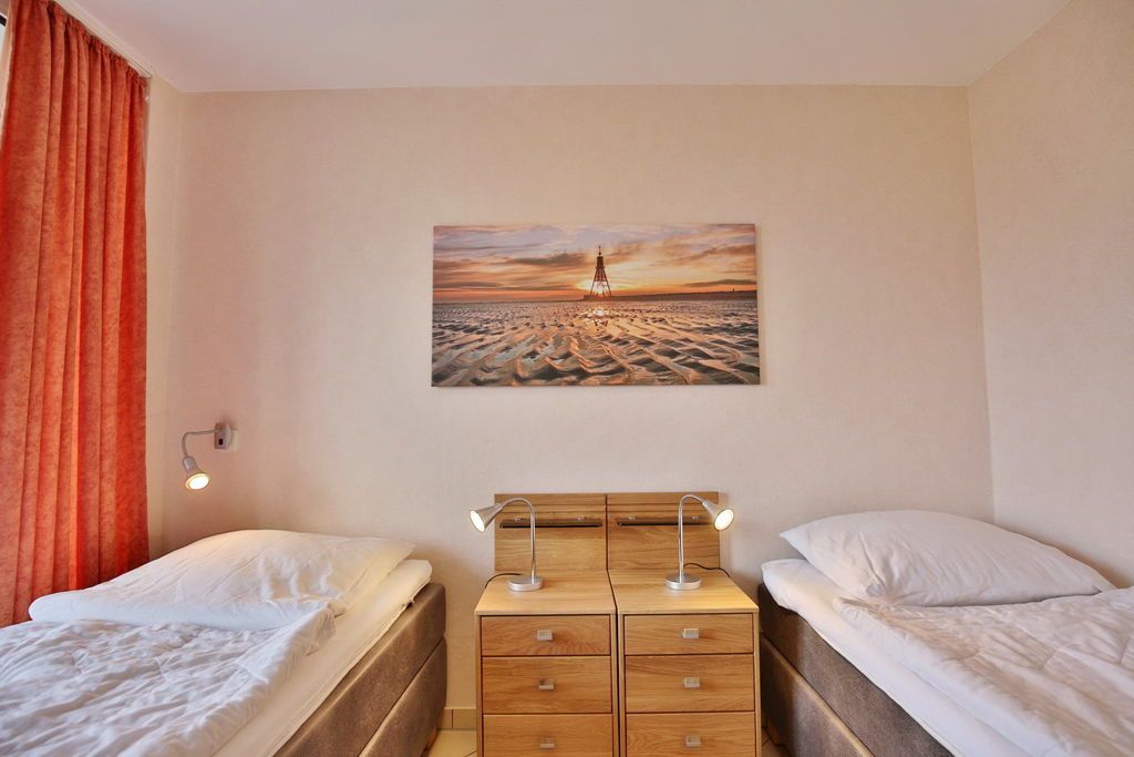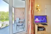 2-Raum-Wohnung auf ca. 40m², 3. Etage, komplett ausgestattet bis 4 Pers., 1 Schlafzimmer mit 2 Einzelbetten (0,90m x 2,00m), 1 kombiniertes Wohn/Schlafzimmer mit Schlafcouch, Sat-TV, kostenloses W-Lan, CD-Radio, Blue-Ray-Player, Küchenzeile mit 2 Pl.-Herd, Mikrowelle und Geschirrspüler, Dusche /WC (neu in 2020), Flur, Balkon (west), keine Haustiere, Tiefgarage #306.