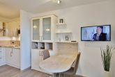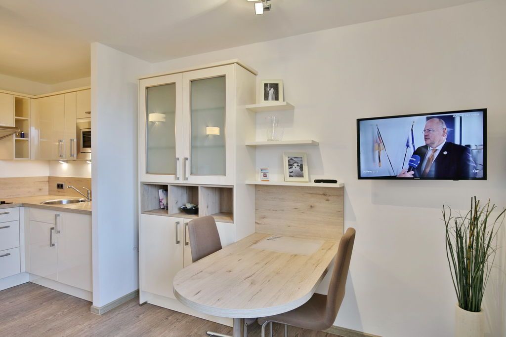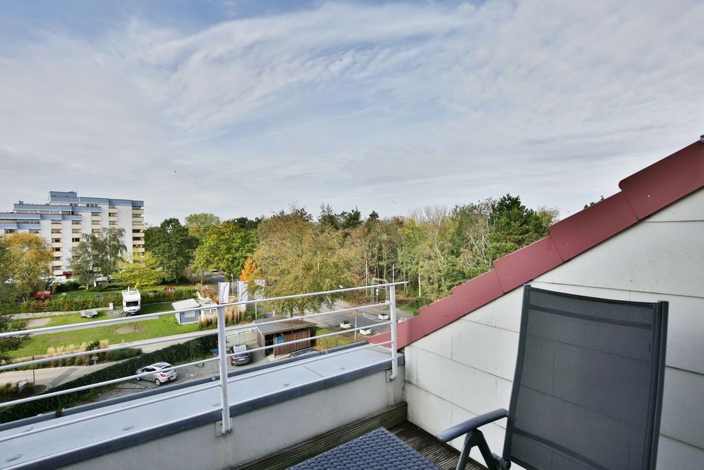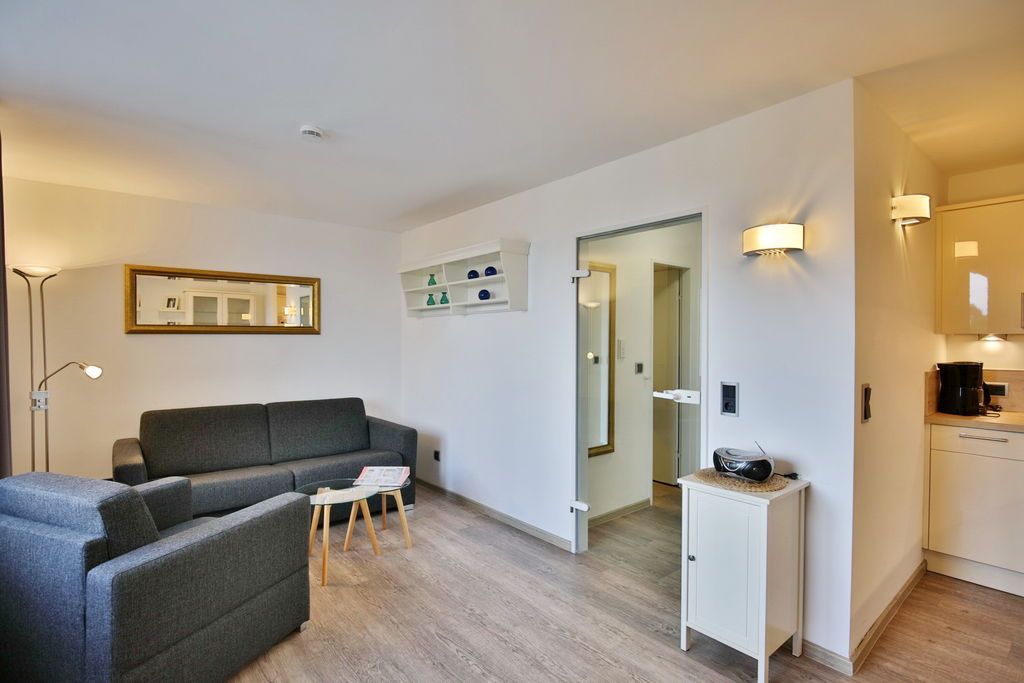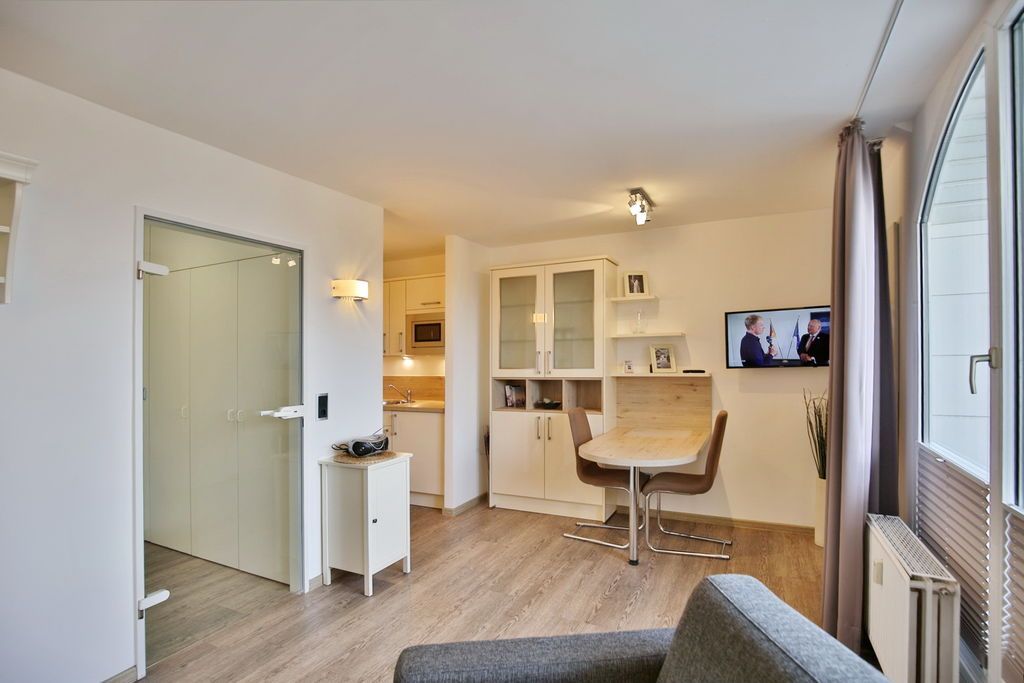 Schönes, neu renoviertes 1-Raum-Appartement auf ca. 28m², 4. Etage, Nichtraucher, komplett ausgestattet bis 2 Pers., 1 kombiniertes Wohn/Schlafzimmer mit Schlafcouch, 1 Einzelbett (0,90x2m)im Nebenraum, SAT-TV, Radio, kostenloses W-Lan, Küchenzeile mit Mikrowelle/Grill, Dusche/WC, Flur, Dachterrasse (west) mit Balkonmöbeln und Sonnenschirm (saisonabhängig), Pkw-Stellplatz #406 in der Tiefgarage